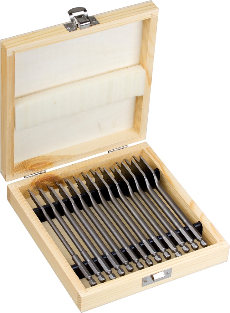 Geharde vlakfreesboor uit CrV-staal met lange centreerpunt, spaanbreker en zijsnijders. Voor zacht- en hardhout, spaanplaat