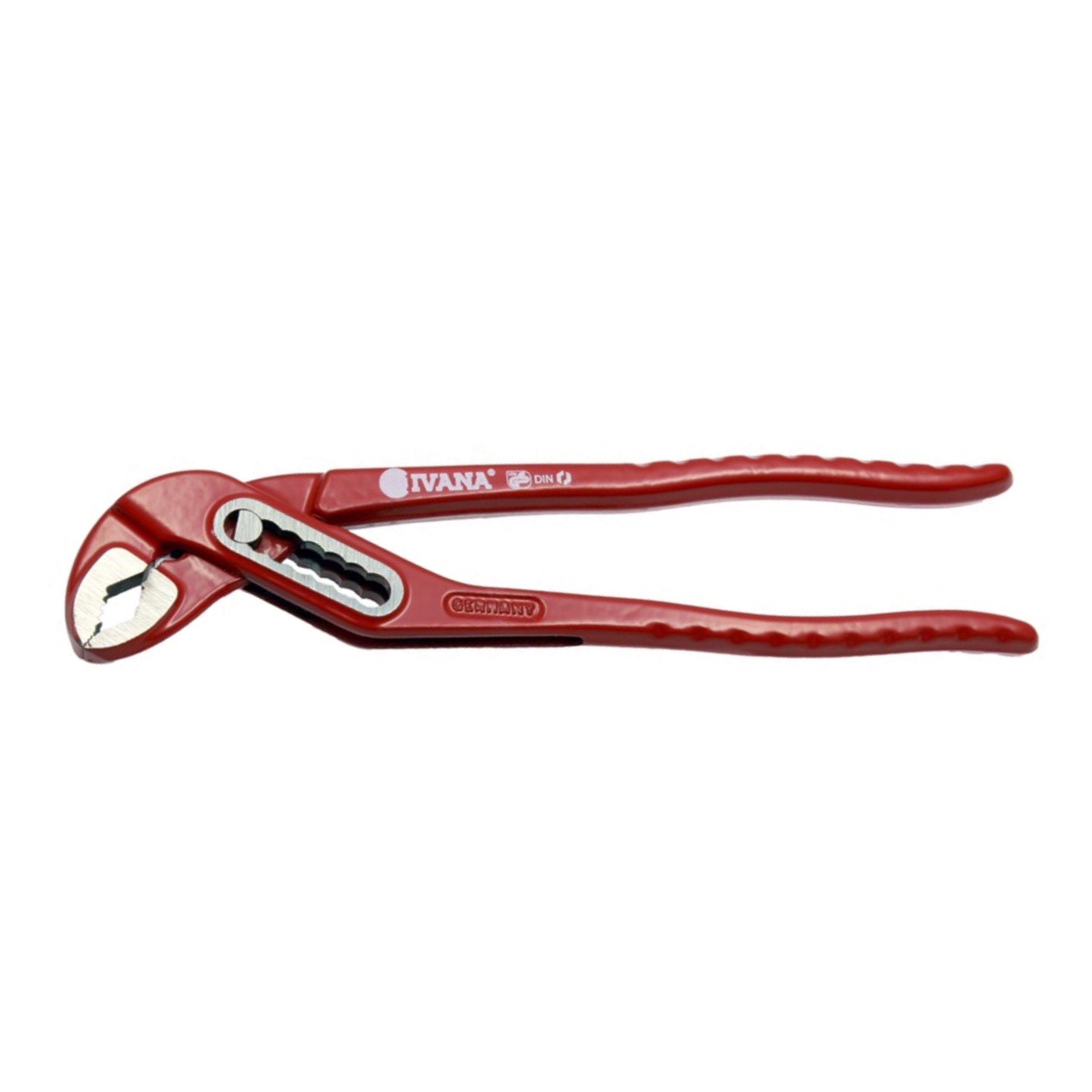 Rood gelakte waterpomptang met een hoge stabiliteit dankzij dubbele geleiding. Zelfklemmend op buizen en moeren: glijdt niet van het werkstuk af en werkt krachtbesparend.