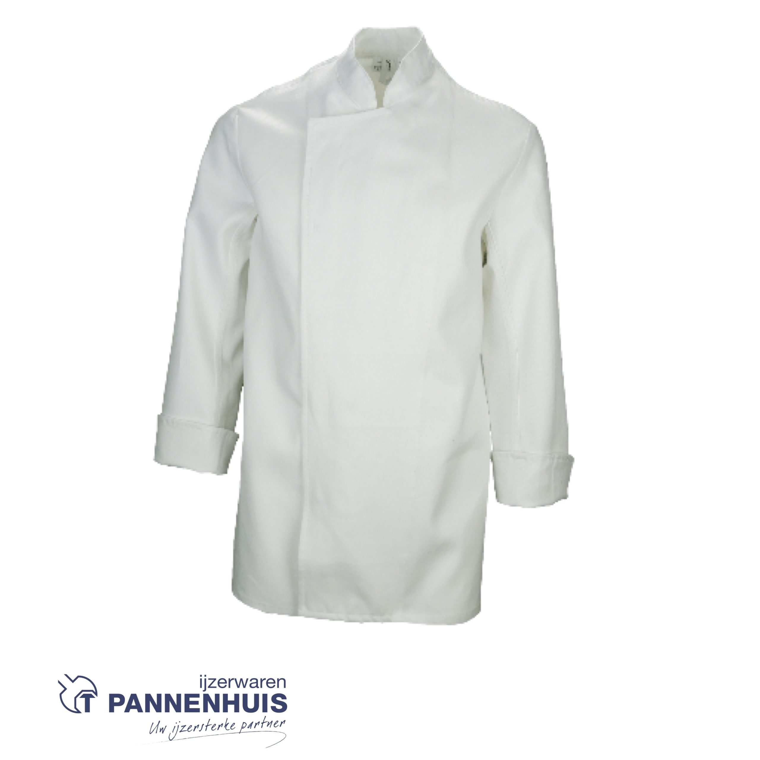 koksvest met officierskraag, zijkantsluiting met verdoken drukknopen, zonder zakken, lange koksmouwen