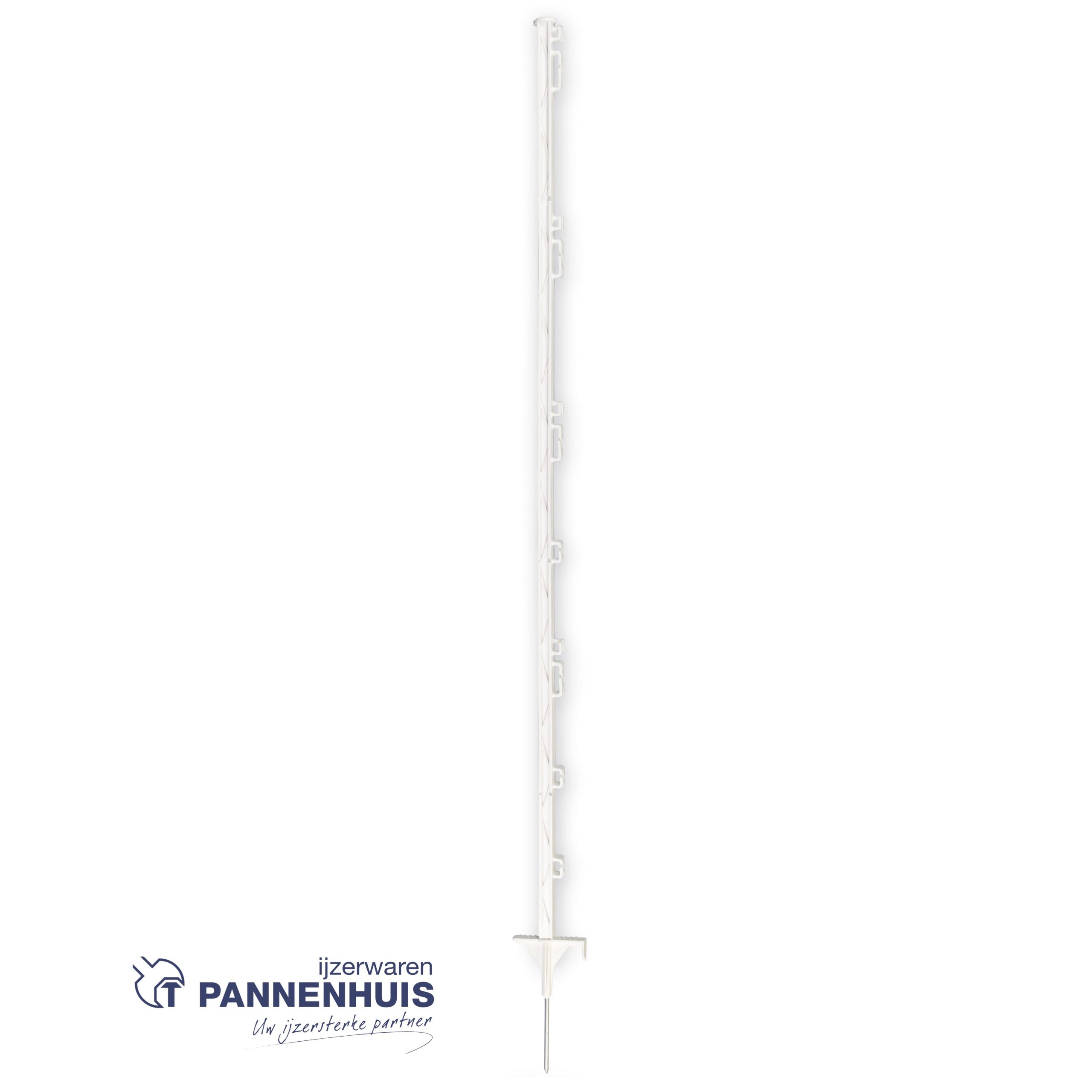 Duurzame witte kunststof paal met versterkte voet en diverse draadhoogtes. Geschikt voor draad, koord en lint tot 20mm. Lengte 160cm en max. rasterhoogte 130cm
