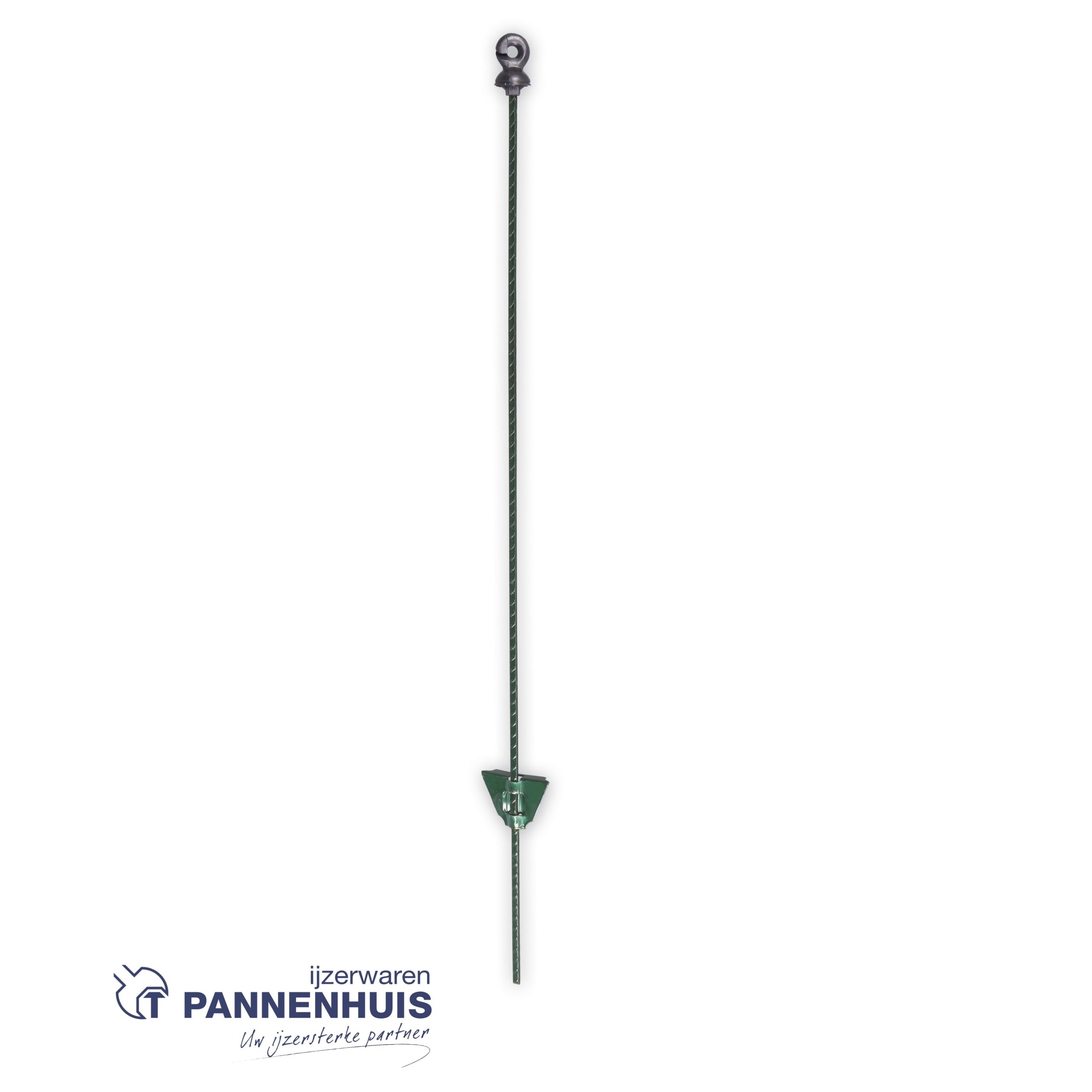 groene ovale veerstalen paal met ringisolator en degelijke voetsteun. Voor installeren van meerdere rasterdraden kunt u isolator artnr. 162-80061-25 of 162-80048-25 toevoegen. Lengte 105 cm en max. afrasteringshoogte 85 cm.