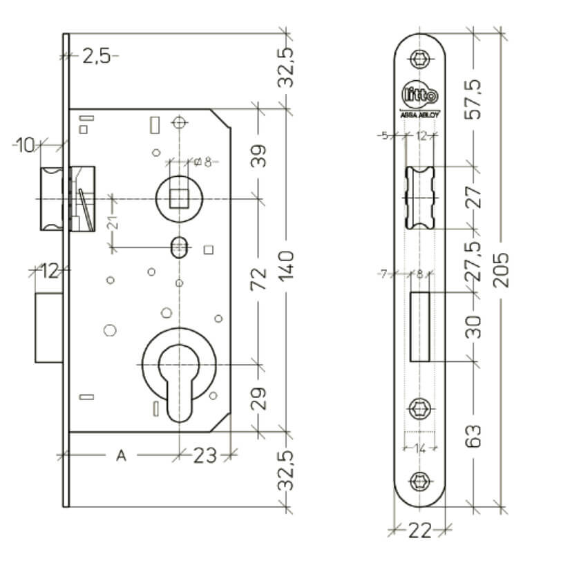 Litto cilinderslot A265621 50 mm as 72 mm afgerond gelakt L/R