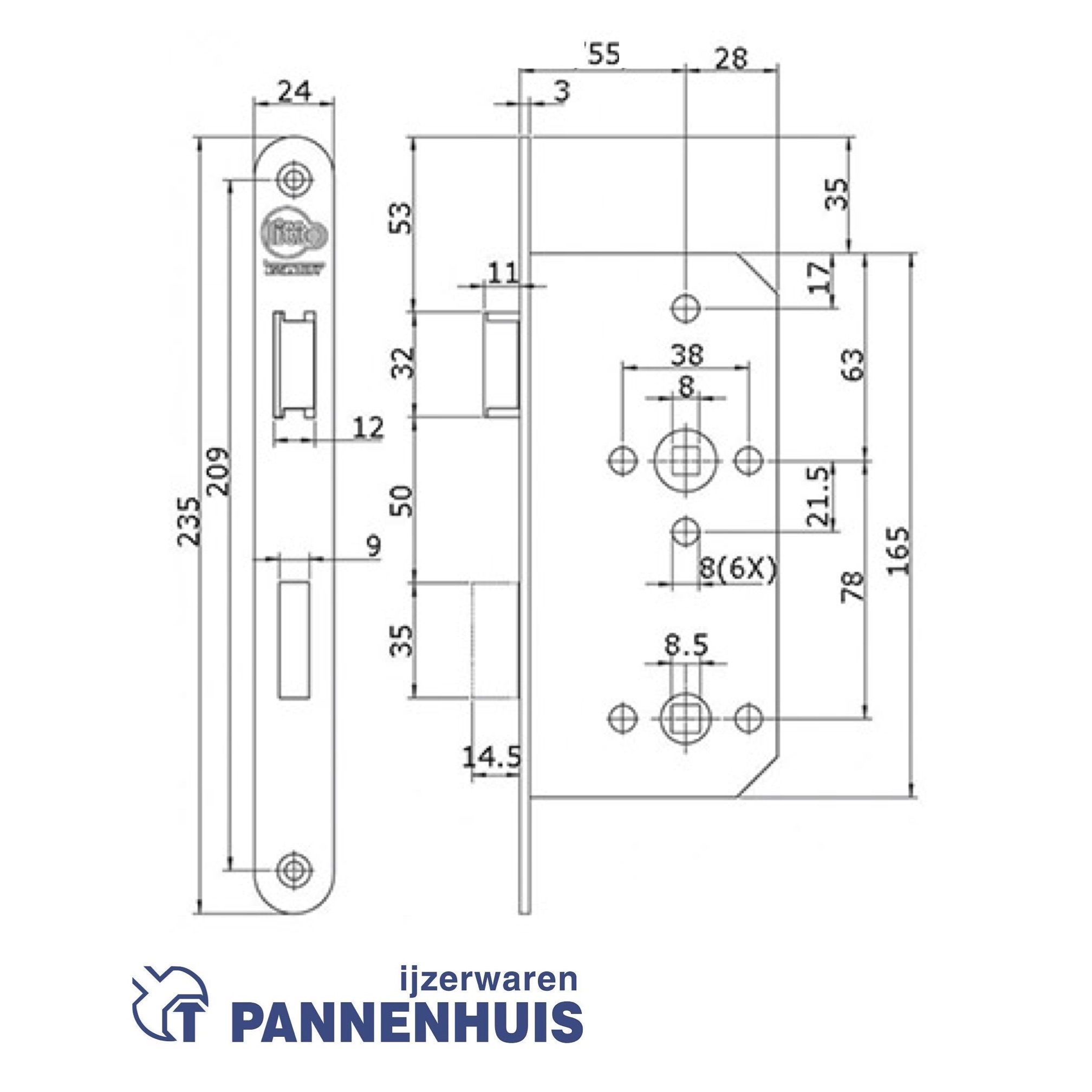 De verschillende types van sloten hebben dezelfde afmetingen van kast, voor- en sluitplaat, zodat men zonder aanpassing van het deurblad van slottype kan omschakelen.