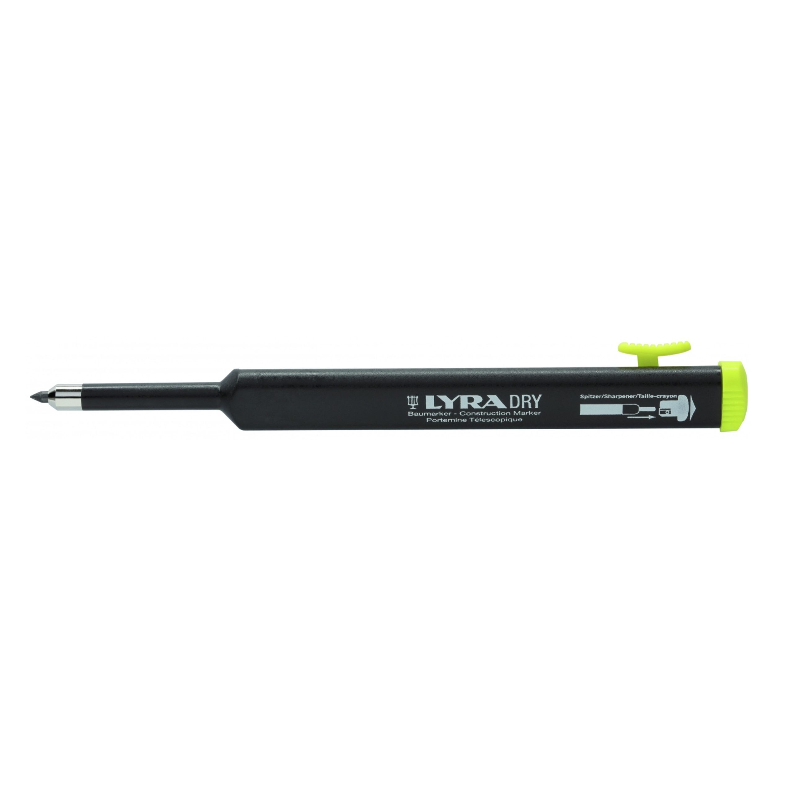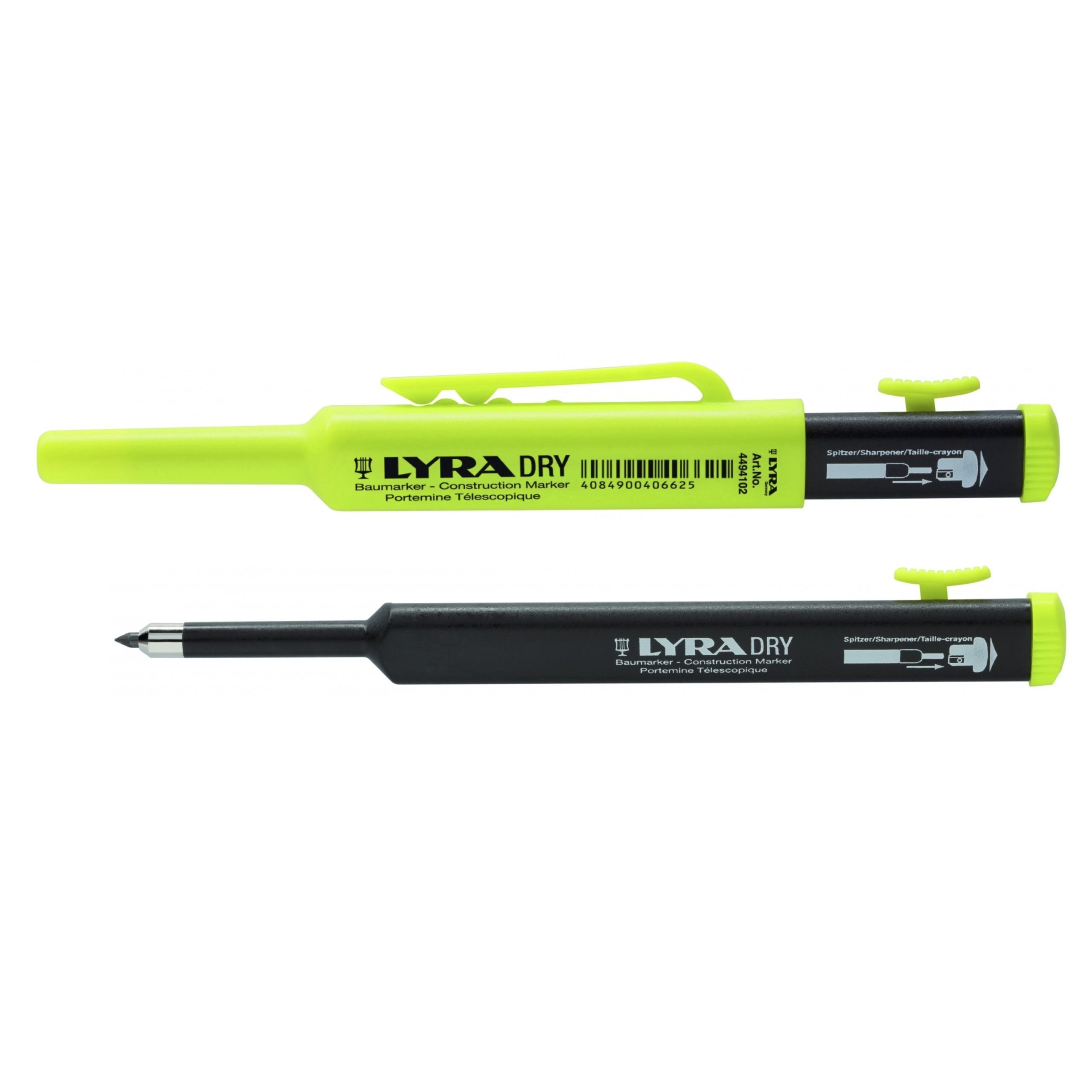Lyra Dry markeerpotlood voor het markeren op materialen zoals hout, metaal, beton, kunststof en tegels. Op gladde materialen is de markering met een droge of een vochtige doek te verwijderen. Het uitschuiven is volgens het systeem van de traditionele afbreekmesjes, de slijper zit in het dopje aan het uiteinde wat met een clicksysteem is bevestigt.
