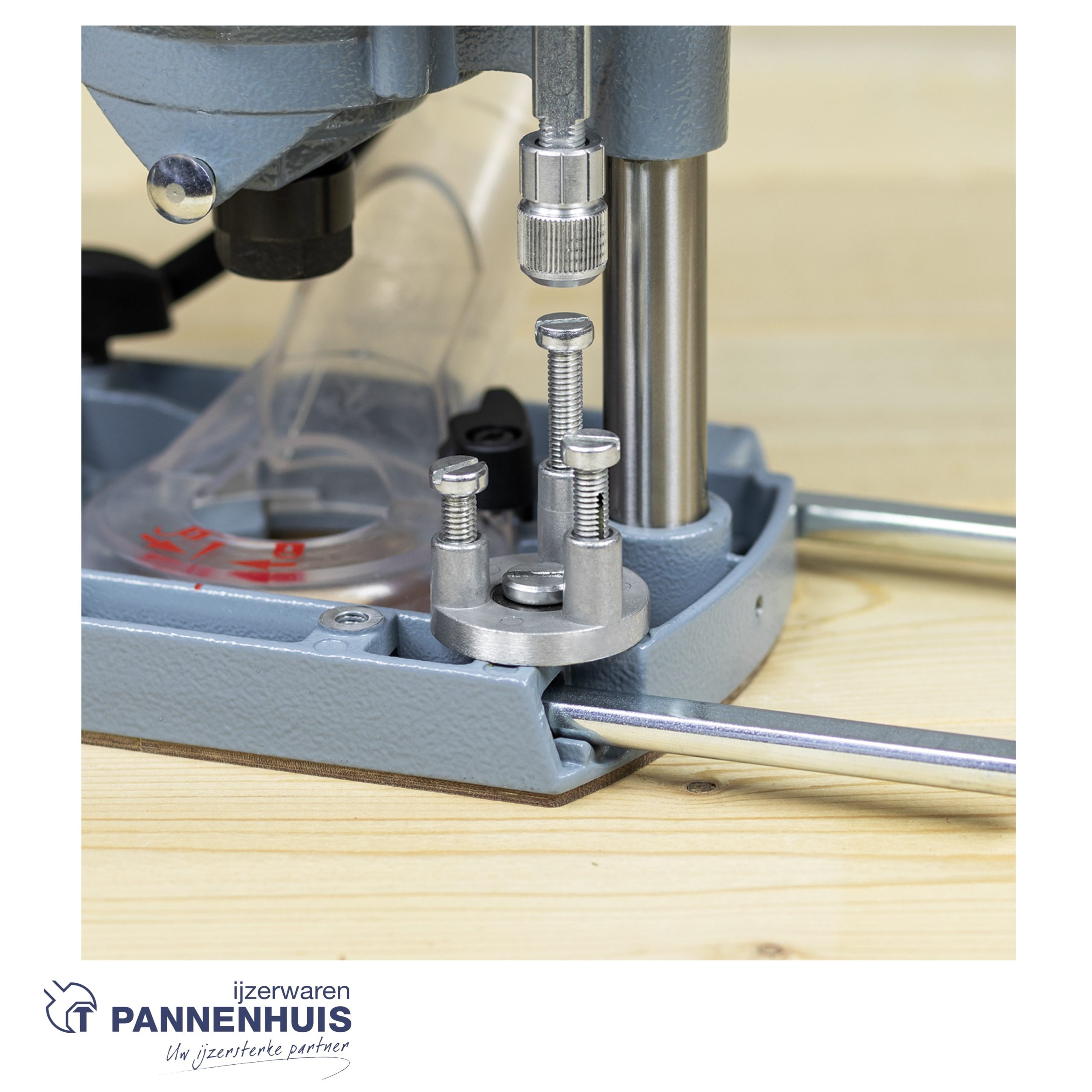 De sleuf in de grondplaat maakt het vlakfrezen van b.v fineerranden mogelijk zonder hulpmiddelen.
