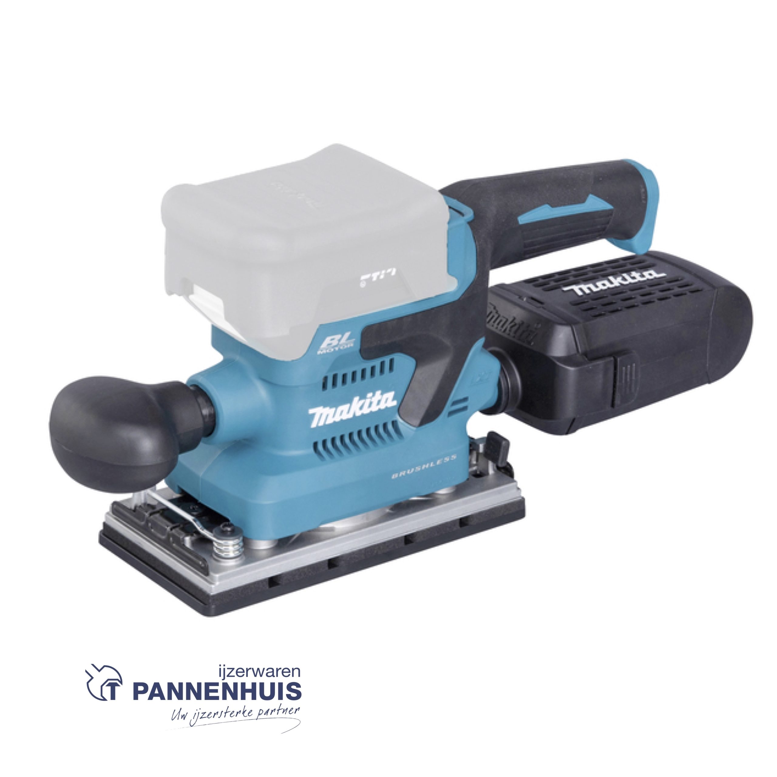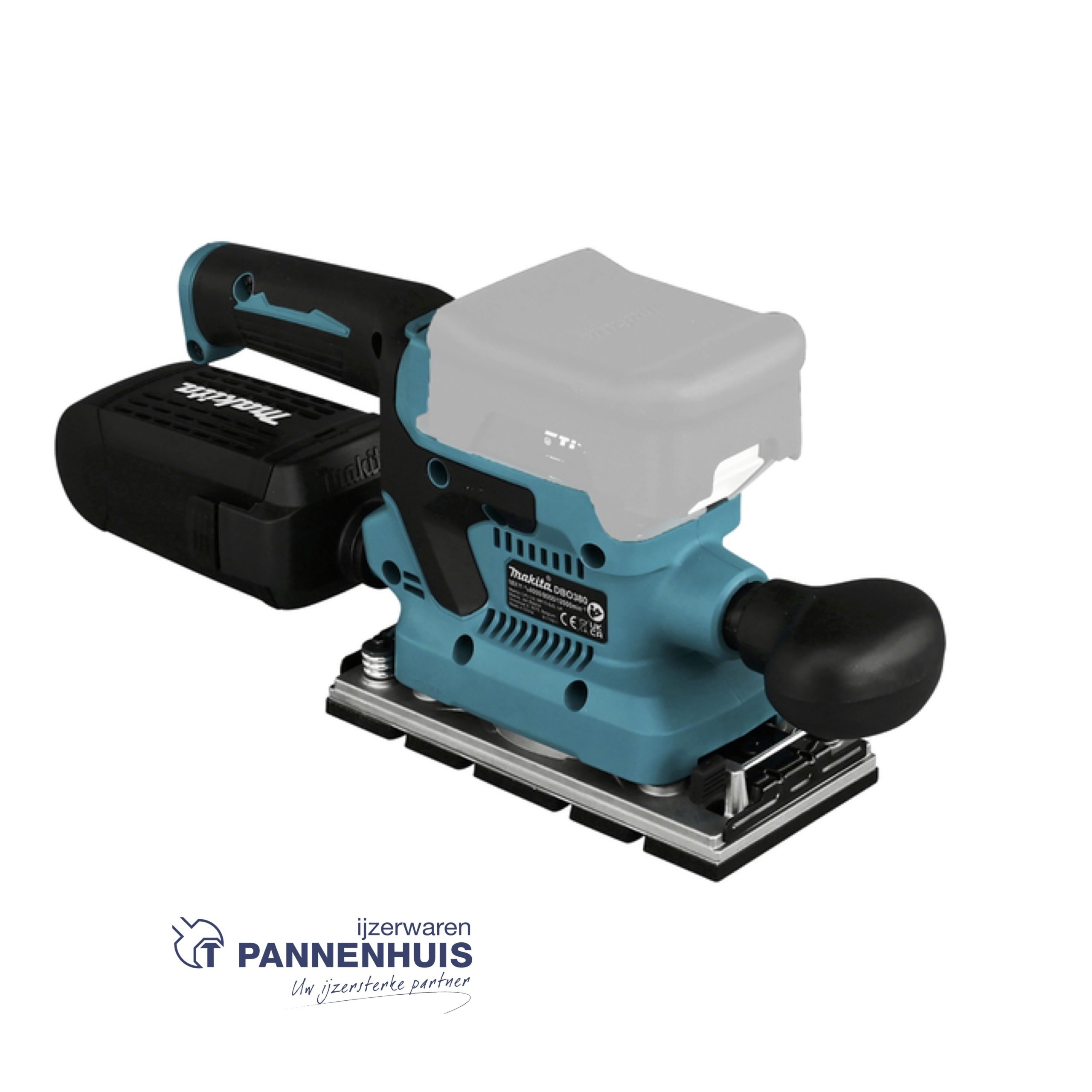 De ergonomische rubberen handgreep van de Makita DBO380 is gemaakt voor een betere pasvorm en grip. De voorhandgreep is zonder gereedschap afneembaar om hoeken te kunnen schuren. Zowel de motor als de accu bevinden zich boven het schuurvlak om fladderen van de schijf te beperken, waardoor een gelijkmatig afgewerkt oppervlak kan worden verkregen.