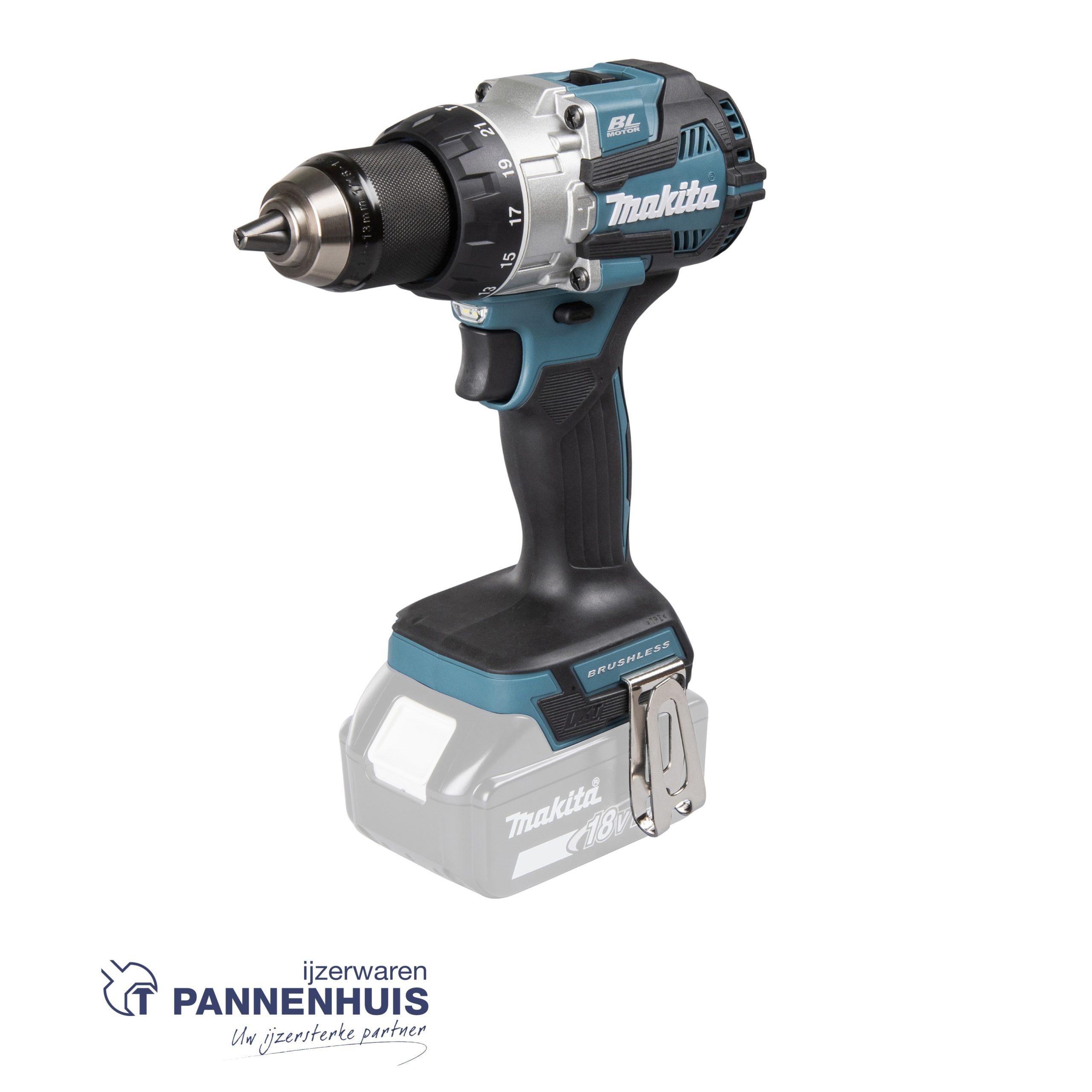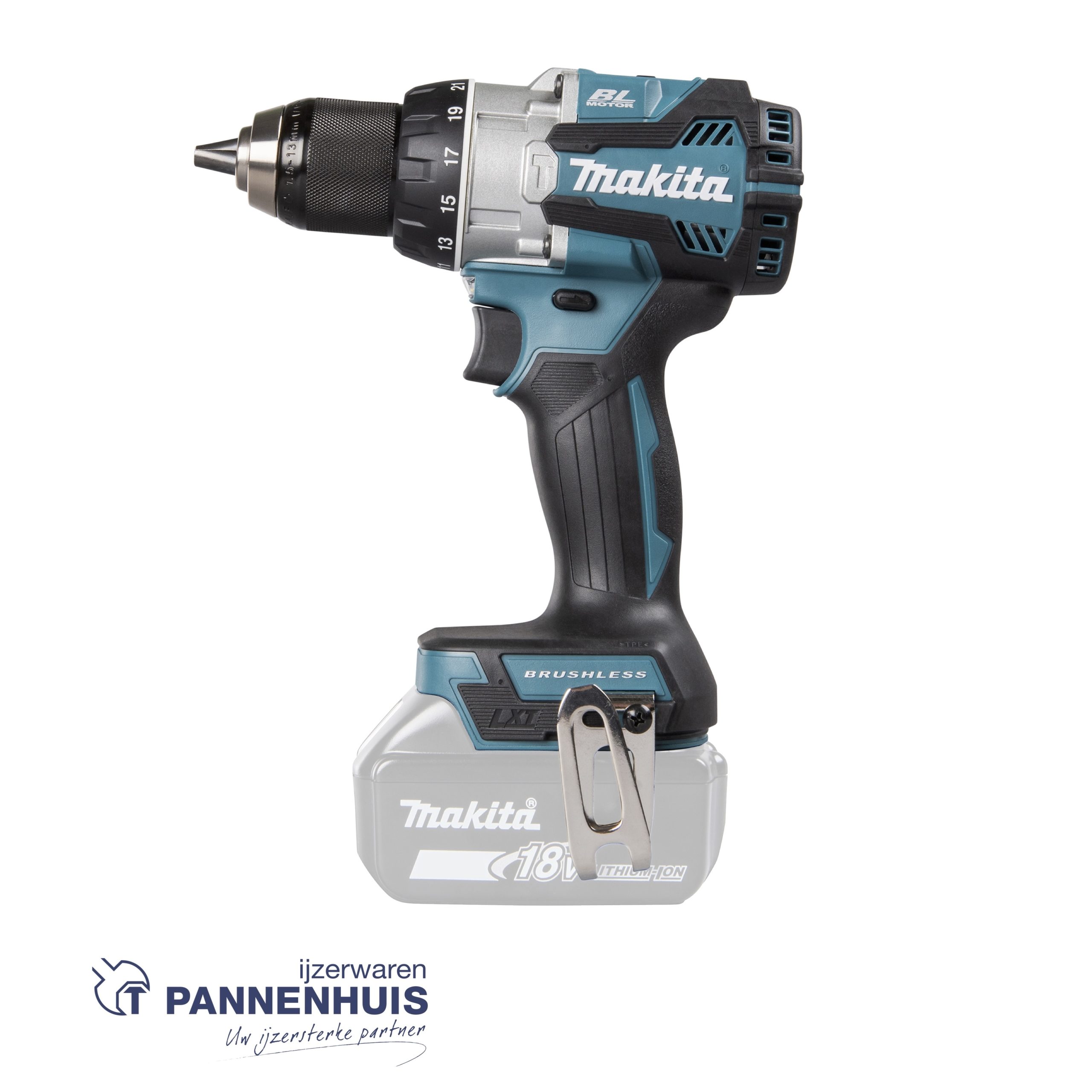 Krachtige accu schroef- en klopboormachine met koolborstelloze motor, koppel 70/36 Nm. Boren in steenmateriaal is mogelijk met de slagfunctie. Hoog koppel, zelfs in de tweede versnelling, dankzij het iets lagere toerental. Voor het schroeven heeft de machine een draaimomentregeling met 21 standen, waarbij de waarden kunnen worden ingesteld tussen 1,0-5,0 Nm. Het Makita XPT systeem beschermt de machine effectief tegen stof en water. De krachtige dubbele LED verlicht het werkterrein efficiënt. De werklamp heeft ook een vertraging, wanneer de lamp nog 10 seconden brandt nadat de bedieningsschakelaar is losgelaten. De volledig metalen boorkop met snelsluiting is bestand tegen zwaar gebruik. Een zijhandgreep is verkrijgbaar als accessoire.