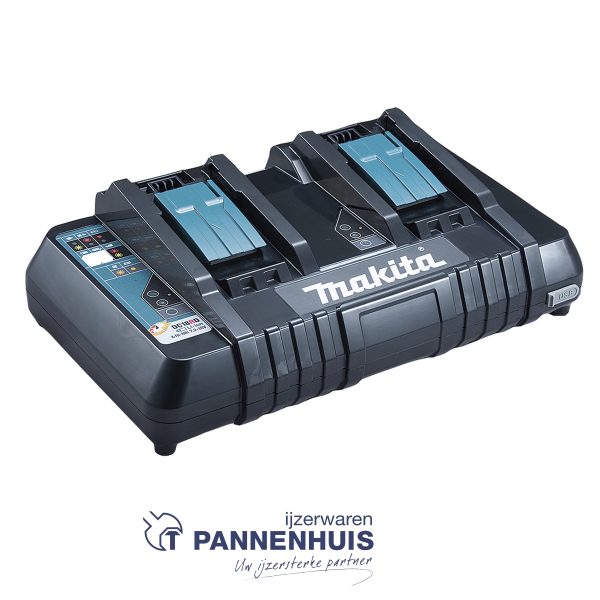Duo snellader voor LXT Li-ion en Ni-MH schuifaccu’s van 9,6 t/m 18V. Door het ventilatiesysteem worden hoge temperaturen in de accu vermeden hetgeen de levensduur van de accu verlengt en het laadproces versnelt.