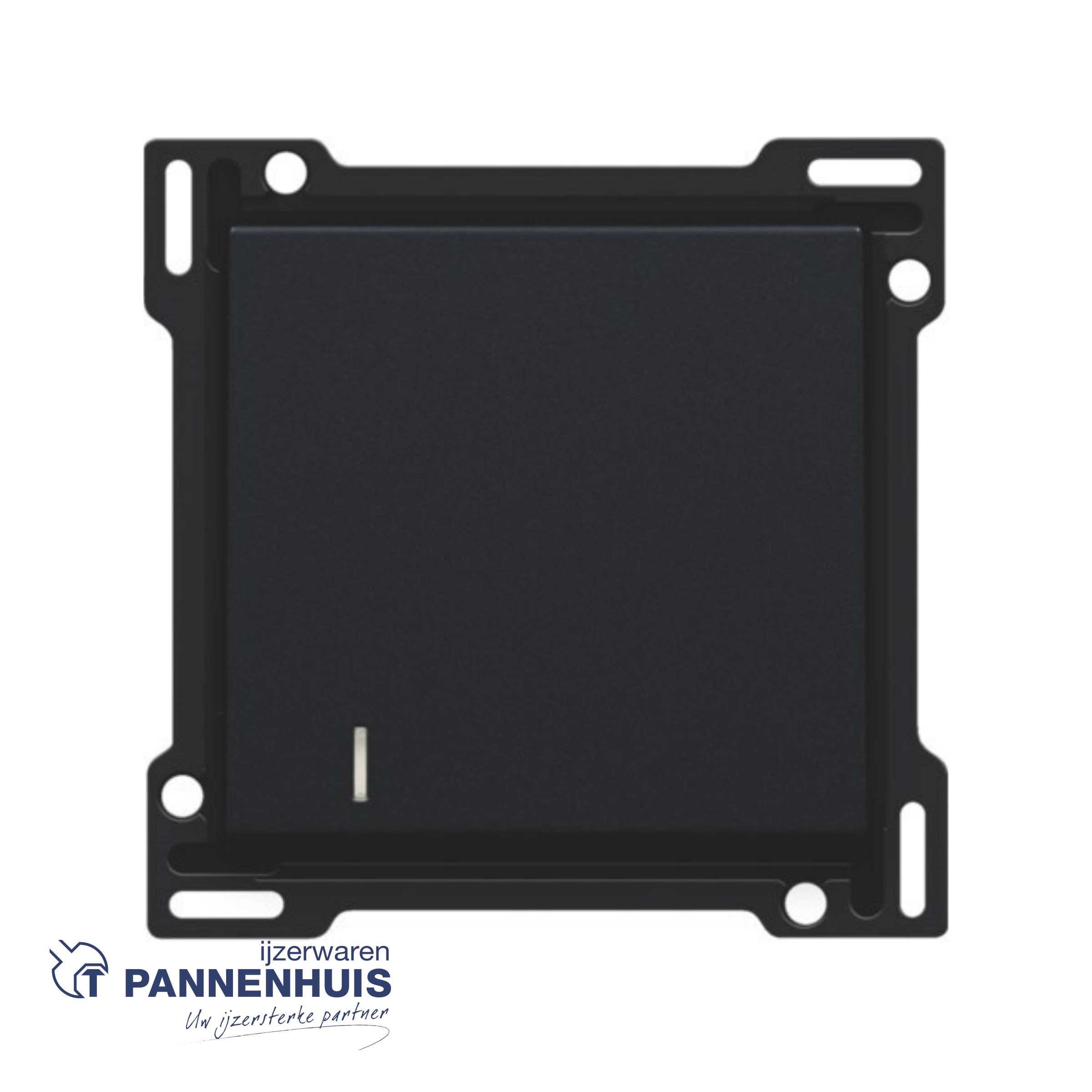 Centraalplaat uitgevoerd met een enkelvoudige drukknop met lens. Met deze drukknop kan je 1 verlichting bedienen. De lens biedt je de mogelijkheid om een ledmodule achter te plaatsen zodat je kan zien of het licht al dan niet ingeschakeld is Afwerkingskleur: black coated.