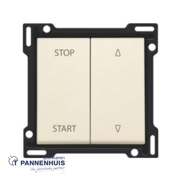Afwerkingsset voor elektrisch gescheiden rolluikschakelaar, cream. De centraalplaat is omringd door een vlakke boord die op de 4 hoeken voorzien is van een rechthoekige opening, waarin zich telkens een multipositionele snaphaak bevindt. De opbouw van de centraalplaat zorgt ervoor dat bij onzorgvuldig pleisterwerk de afdekplaat steeds vlak tegen de muur bevestigd kan worden dankzij de snaphaken. Dit werkt in twee richtingen: als de inbouwdoos uit het pleisterwerk steekt, vangen de multipositionele snaphaken een speling tussen 1 à 1,2 mm op; als de inbouwdoos te diep in het pleisterwerk verzonken is, dan kunnen de snaphaken een speling tot 1,8 mm opvangen. De vlakke boord rondom de centraalplaat bevat eveneens 4 ronde openingen die ervoor zorgen dat de afdekplaat correct gepositioneerd kan worden ten opzichte van de centraalplaat. Na montage van het geheel (afdekplaat, afwerkingsset en mechanisme) zijn er, dankzij de vlakke boord aan de centraalplaat, geen metalen delen zichtbaar.