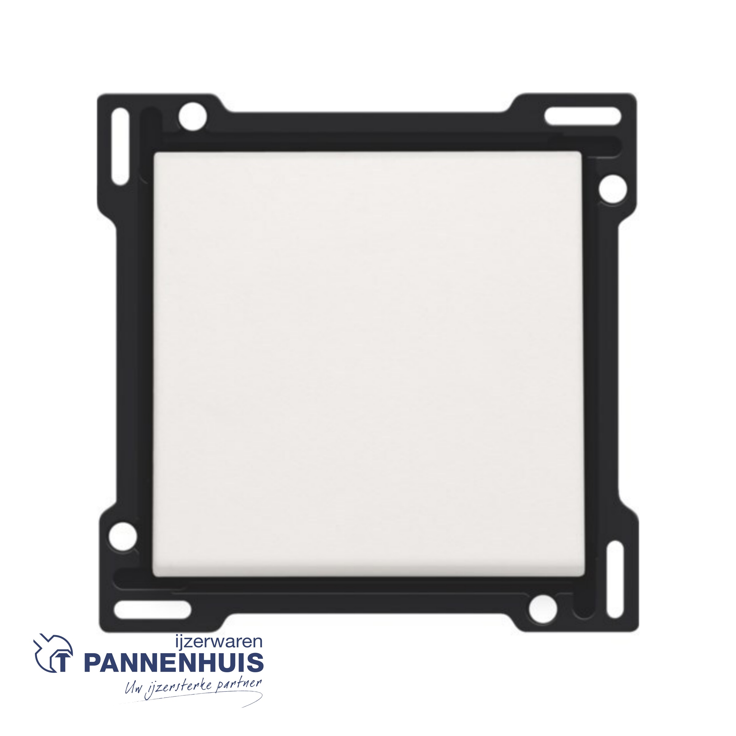 Afwerkingsset voor enkelvoudige schakelaar of drukknop, white. De centraalplaat is omringd door een vlakke boord die op de 4 hoeken voorzien is van een rechthoekige opening, waarin zich telkens een multipositionele snaphaak bevindt. De opbouw van de centraalplaat zorgt ervoor dat bij onzorgvuldig pleisterwerk de afdekplaat steeds vlak tegen de muur bevestigd kan worden dankzij de snaphaken. Dit werkt in twee richtingen: als de inbouwdoos uit het pleisterwerk steekt, vangen de multipositionele snaphaken een speling tussen 1 Ã 1,2 mm op; als de inbouwdoos te diep in het pleisterwerk verzonken is, dan kunnen de snaphaken een speling tot 1,8 mm opvangen. De vlakke boord rondom de centraalplaat bevat eveneens 4 ronde openingen die ervoor zorgen dat de afdekplaat correct gepositioneerd kan worden ten opzichte van de centraalplaat. Na montage van het geheel (afdekplaat, afwerkingsset en mechanisme) zijn er, dankzij de vlakke boord aan de centraalplaat, geen metalen delen zichtbaar.