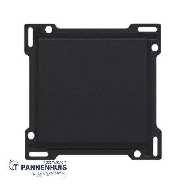 Afwerkingsset voor enkelvoudige schakelaar of drukknop, black coated. De centraalplaat is omringd door een vlakke boord die op de 4 hoeken voorzien is van een rechthoekige opening, waarin zich telkens een multipositionele snaphaak bevindt. De opbouw van de centraalplaat zorgt ervoor dat bij onzorgvuldig pleisterwerk de afdekplaat steeds vlak tegen de muur bevestigd kan worden dankzij de snaphaken. Dit werkt in twee richtingen: als de inbouwdoos uit het pleisterwerk steekt, vangen de multipositionele snaphaken een speling tussen 1 à 1,2 mm op; als de inbouwdoos te diep in het pleisterwerk verzonken is, dan kunnen de snaphaken een speling tot 1,8 mm opvangen. De vlakke boord rondom de centraalplaat bevat eveneens 4 ronde openingen die ervoor zorgen dat de afdekplaat correct gepositioneerd kan worden ten opzichte van de centraalplaat. Na montage van het geheel (afdekplaat, afwerkingsset en mechanisme) zijn er, dankzij de vlakke boord aan de centraalplaat, geen metalen delen zichtbaar.
