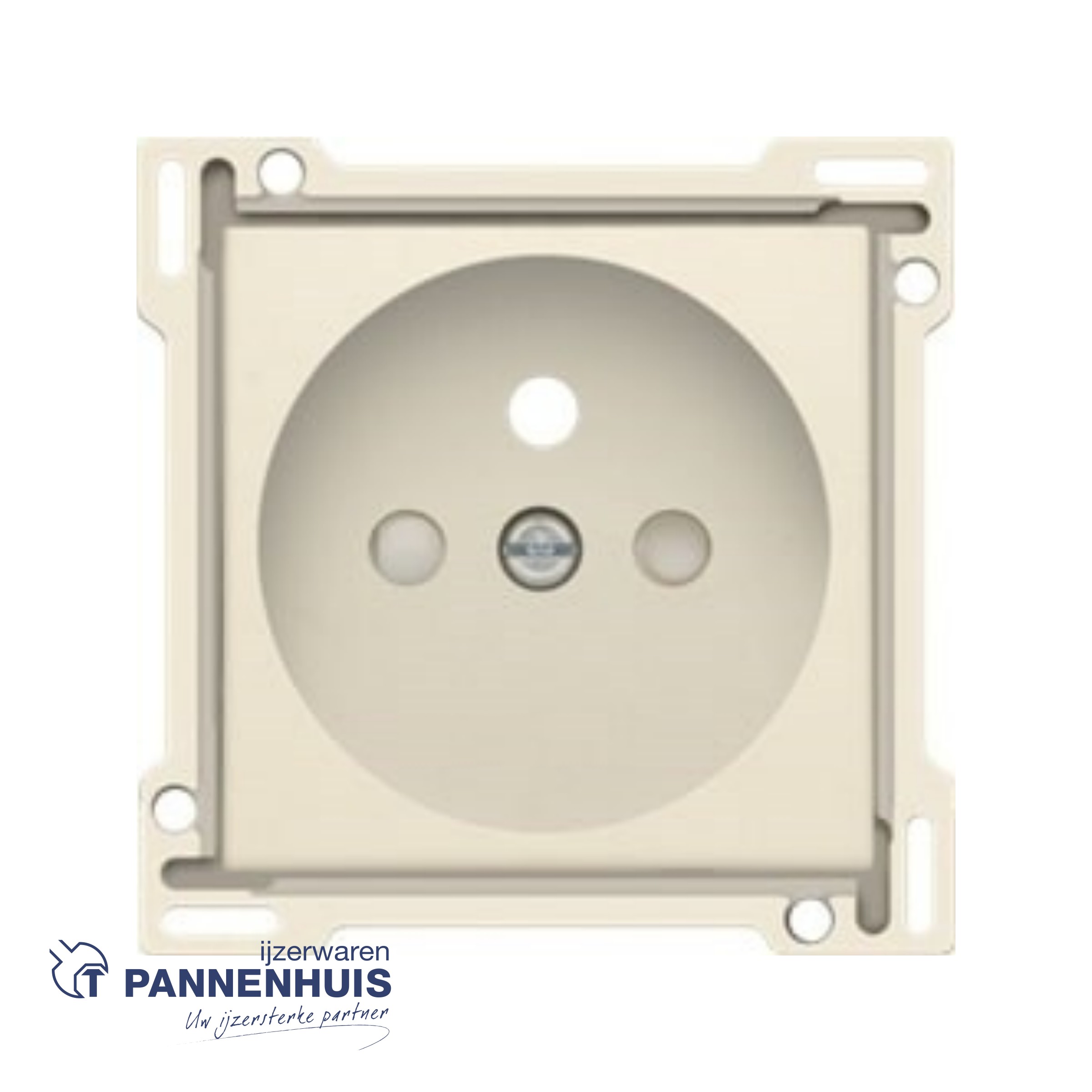 Centraalplaat voor inbouwstopcontact met penaarde en beschermingsafsluiters. Deze centraalplaat dient gebruikt te worden op een stopcontact met inbouwdiepte van 28,5mm. Afwerkingskleur: cream.