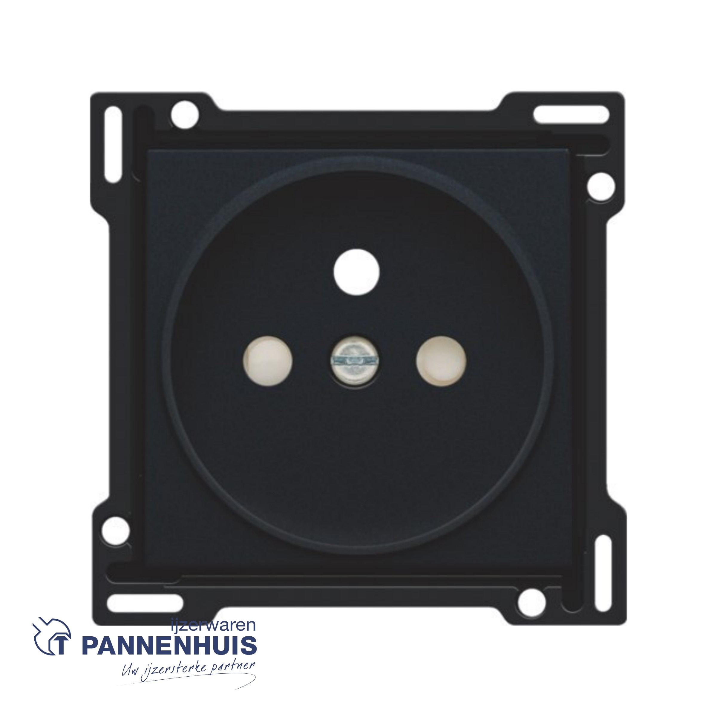 Centraalplaat voor inbouwstopcontact met penaarde en beschermingsafsluiters. Deze centraalplaat dient gebruikt te worden op een stopcontact met inbouwdiepte van 21 mm. Afwerkingskleur: black coated.