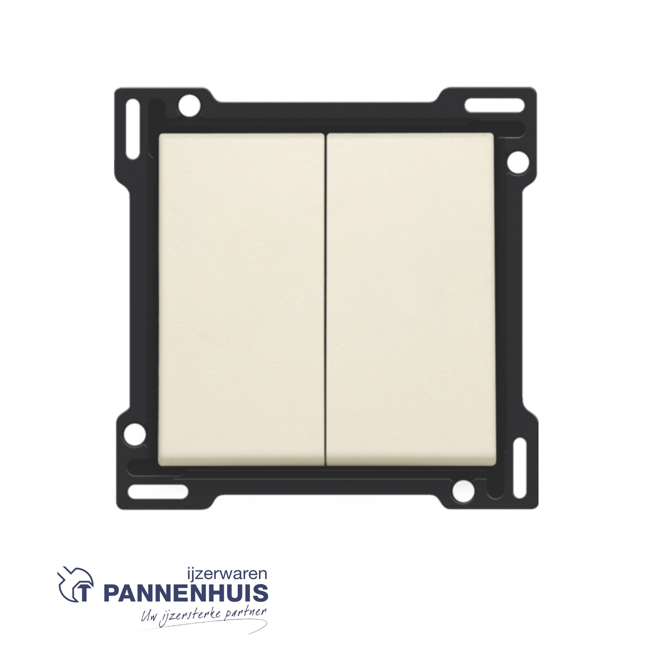 Afwerkingsset voor serieschakelaar, wisselschakelaar + drukknop N.O., dubbele wisselschakelaar of dubbele drukknop N.O. of N.G. , cream. De centraalplaat is omringd door een vlakke boord die op de 4 hoeken voorzien is van een rechthoekige opening, waarin zich telkens een multipositionele snaphaak bevindt. De opbouw van de centraalplaat zorgt ervoor dat bij onzorgvuldig pleisterwerk de afdekplaat steeds vlak tegen de muur bevestigd kan worden dankzij de snaphaken. Dit werkt in twee richtingen: als de inbouwdoos uit het pleisterwerk steekt, vangen de multipositionele snaphaken een speling tussen 1 à 1,2 mm op; als de inbouwdoos te diep in het pleisterwerk verzonken is, dan kunnen de snaphaken een speling tot 1,8 mm opvangen. De vlakke boord rondom de centraalplaat bevat eveneens 4 ronde openingen die ervoor zorgen dat de afdekplaat correct gepositioneerd kan worden ten opzichte van de centraalplaat. Na montage van het geheel (afdekplaat, afwerkingsset en mechanisme) zijn er, dankzij de vlakke boord aan de centraalplaat, geen metalen delen zichtbaar.