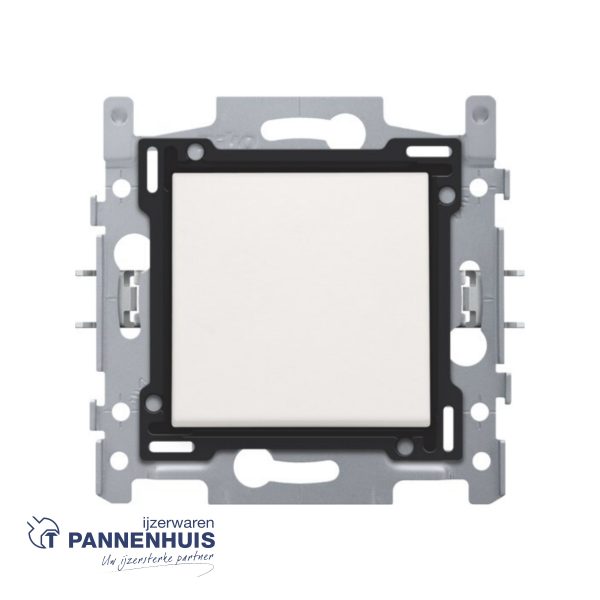 Afwerkingsset voor enkelvoudige schakelaar of drukknop, white. De centraalplaat is omringd door een vlakke boord die op de 4 hoeken voorzien is van een rechthoekige opening, waarin zich telkens een multipositionele snaphaak bevindt. De opbouw van de centraalplaat zorgt ervoor dat bij onzorgvuldig pleisterwerk de afdekplaat steeds vlak tegen de muur bevestigd kan worden dankzij de snaphaken. Dit werkt in twee richtingen: als de inbouwdoos uit het pleisterwerk steekt, vangen de multipositionele snaphaken een speling tussen 1 à 1,2 mm op; als de inbouwdoos te diep in het pleisterwerk verzonken is, dan kunnen de snaphaken een speling tot 1,8 mm opvangen. De vlakke boord rondom de centraalplaat bevat eveneens 4 ronde openingen die ervoor zorgen dat de afdekplaat correct gepositioneerd kan worden ten opzichte van de centraalplaat. Na montage van het geheel (afdekplaat, afwerkingsset en mechanisme) zijn er, dankzij de vlakke boord aan de centraalplaat, geen metalen delen zichtbaar.