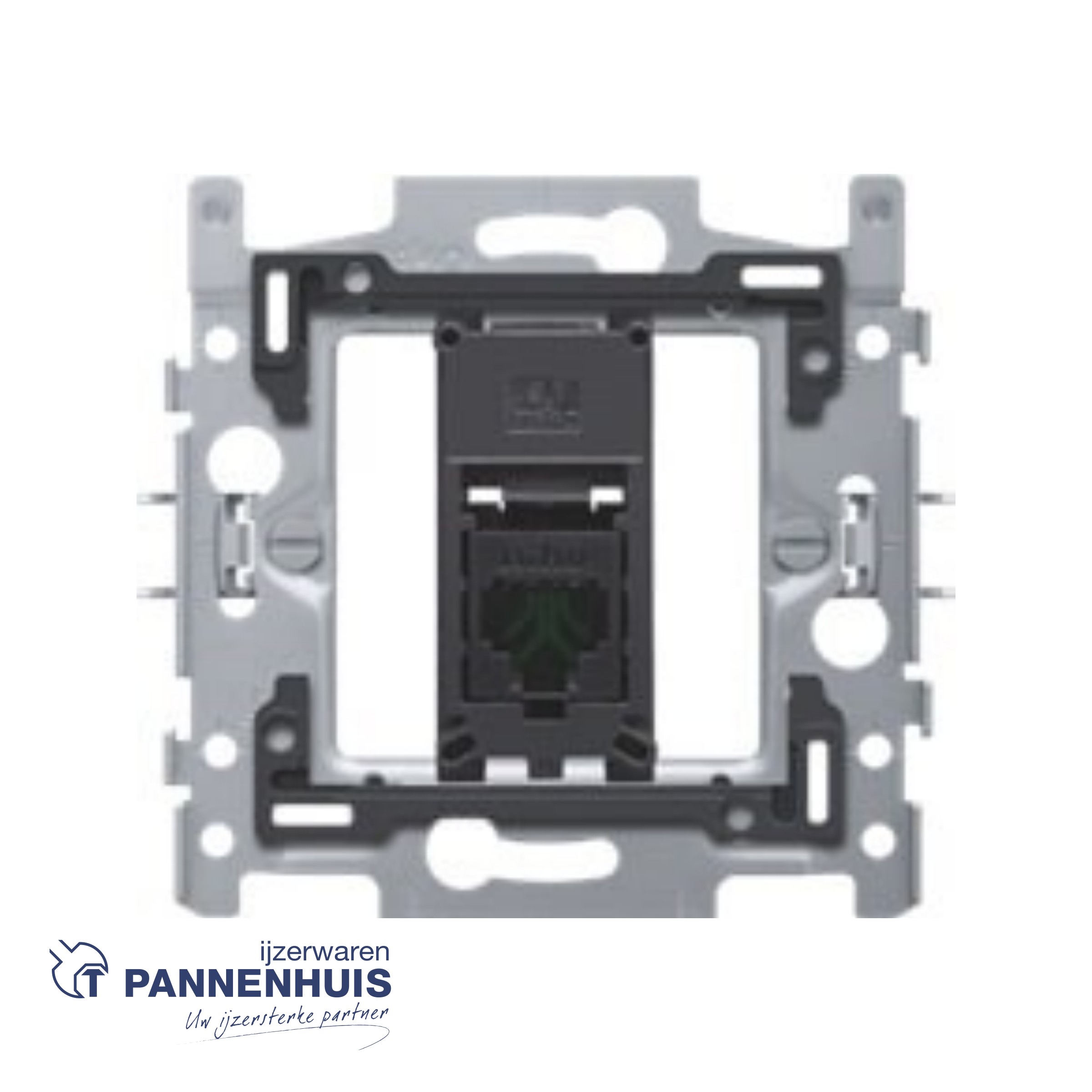 Niko stopcontactsokkel met 1 RJ45-aansluitpunt UTP Cat. 5E. Deze dient om netwerkverbinding met 1 apparaat te maken voor telefonie, Ethernet, IP of internet-toepassingen. Het stopcontact wordt in sterconfiguratie aangesloten met de centrale aansluitkast door middel van een kabel van hetzelfde performantietype. De sokkel heeft binnenafmetingen van 45 x 45 mm en buitenafmetingen van 60 x 71 mm en is voorzien van klauwbevestiging. Een afwerkingsset in een kleur naar keuze moet afzonderlijk besteld worden.