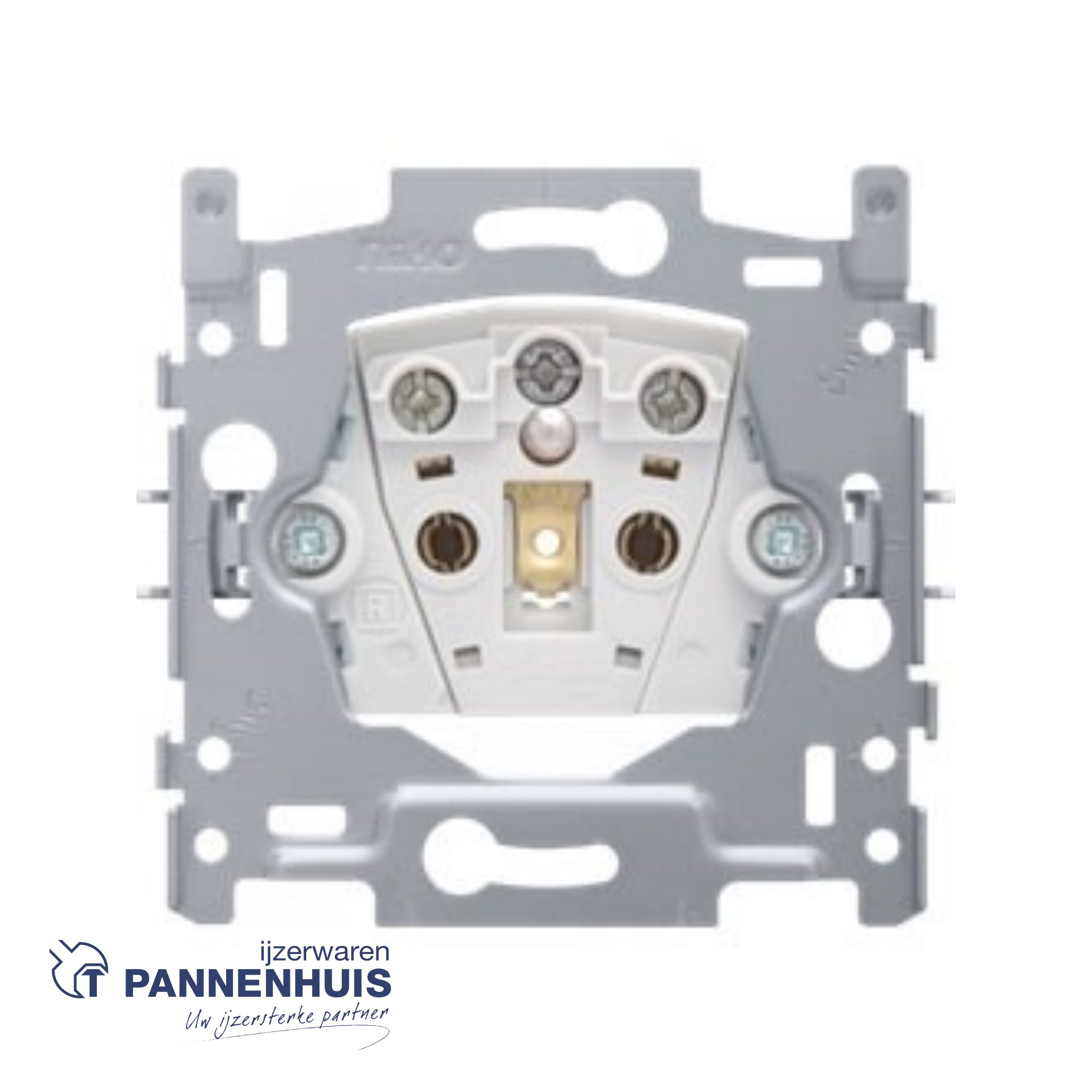 Mechanisme voor een stopcontact met penaarde, klauwbevestiging en beschermingsafsluiters. Dit stopcontact heeft een inbouwdiepte van 28,5 mm. Een afwerkingsset en een afdekplaat in een kleur naar keuze moet afzonderlijk besteld worden.