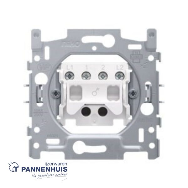 Mechanisme voor een tweepolige schakelaar, een tweepolige controleschakelaar of een tweepolige trekschakelaar, met klauwbevestiging. Met een tweepolige schakelaar kan je een lamp of een aantal parallel geschakelde lampen aan- of uitschakelen. Een afwerkingsset en een afdekplaat in een kleur naar keuze moet afzonderlijk besteld worden.