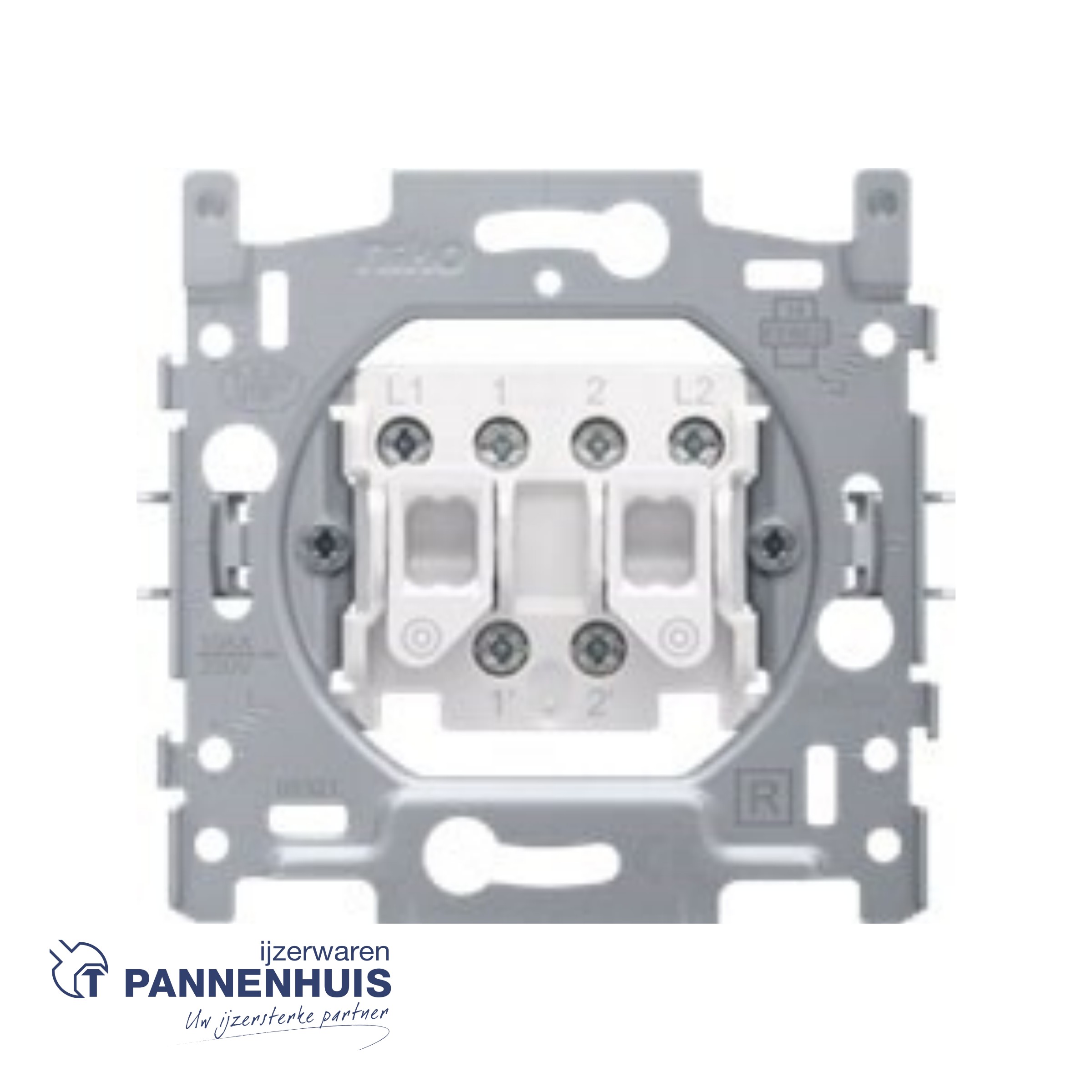 Mechanisme voor een drukknop N.O. of N.G. met twee toetsen, met klauwbevestiging. Een afwerkingsset en een afdekplaat in een kleur naar keuze moet afzonderlijk besteld worden.