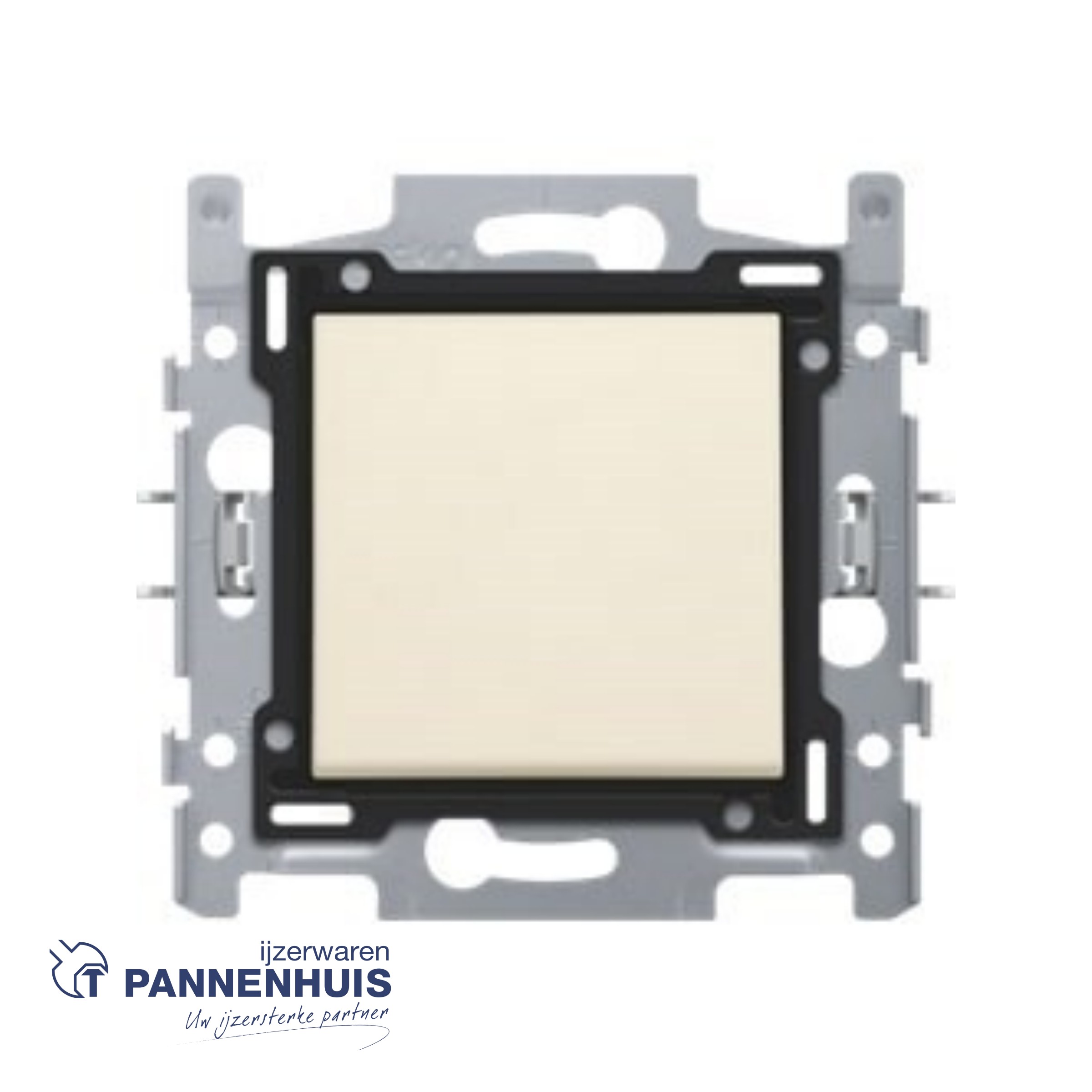 Afwerkingsset voor enkelvoudige schakelaar of drukknop, cream. De centraalplaat is omringd door een vlakke boord die op de 4 hoeken voorzien is van een rechthoekige opening, waarin zich telkens een multipositionele snaphaak bevindt. De opbouw van de centraalplaat zorgt ervoor dat bij onzorgvuldig pleisterwerk de afdekplaat steeds vlak tegen de muur bevestigd kan worden dankzij de snaphaken. Dit werkt in twee richtingen: als de inbouwdoos uit het pleisterwerk steekt, vangen de multipositionele snaphaken een speling tussen 1 Ã 1,2 mm op; als de inbouwdoos te diep in het pleisterwerk verzonken is, dan kunnen de snaphaken een speling tot 1,8 mm opvangen. De vlakke boord rondom de centraalplaat bevat eveneens 4 ronde openingen die ervoor zorgen dat de afdekplaat correct gepositioneerd kan worden ten opzichte van de centraalplaat. Na montage van het geheel (afdekplaat, afwerkingsset en mechanisme) zijn er, dankzij de vlakke boord aan de centraalplaat, geen metalen delen zichtbaar.