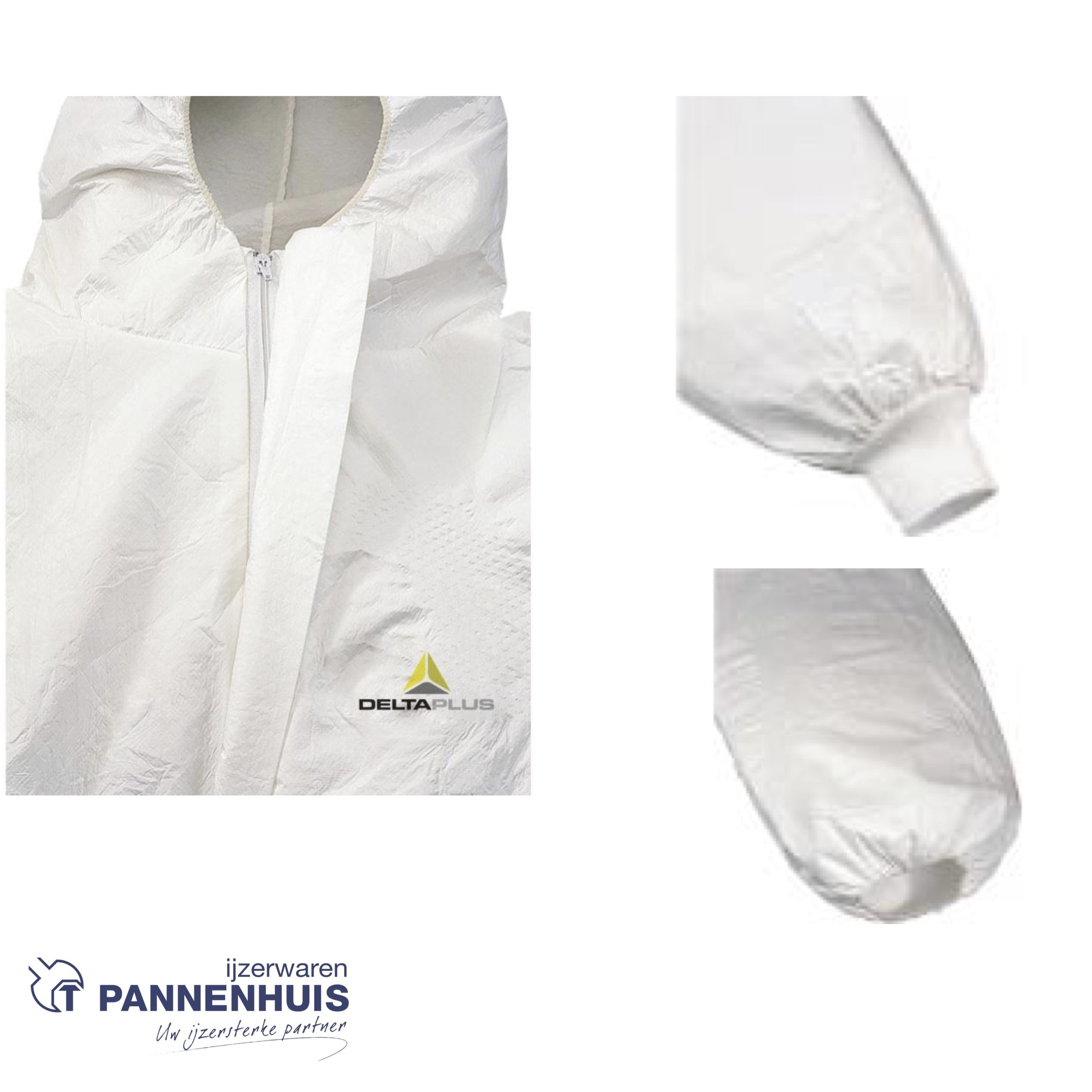 Overall met hoofdkap met elastiek. Deltatek® 5000 non woven microporeuze gelamineerde vezel. Ritssluiting onder overslag (opening bovenaan of onderaan). Aansluitelastiek in de taille en aan de enkels. Ribboord polsen. Antistatisch. Luchtdichte stukverpakking.