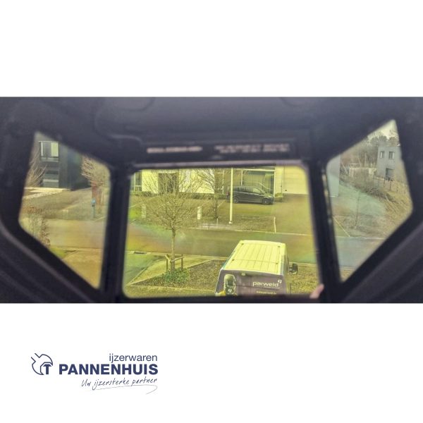 2 actieve zijruiten voor een panoramisch zicht tijdens het lassen. De DIN sterkte is identiek aan deze van het hoofdscherm.