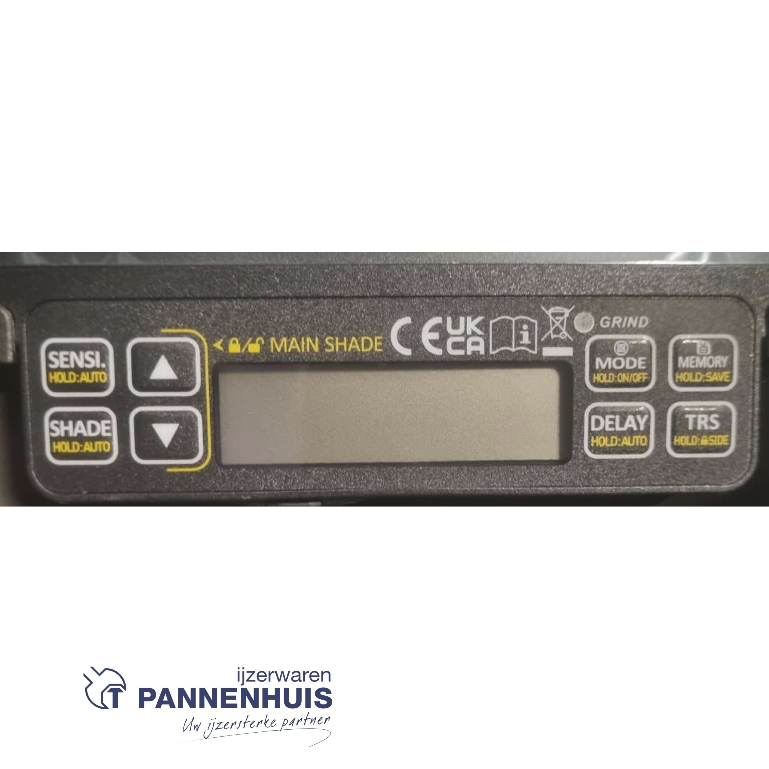 LCD Scherm voor meer instelmogelijkheden – auto shade modus voor snelle instelling, las, slijp – en snijmodus, geheugenfunctie, sensitiviteit en delay. DIN sterkte is instelbaar in digitale stappen van 0.5 DIN.