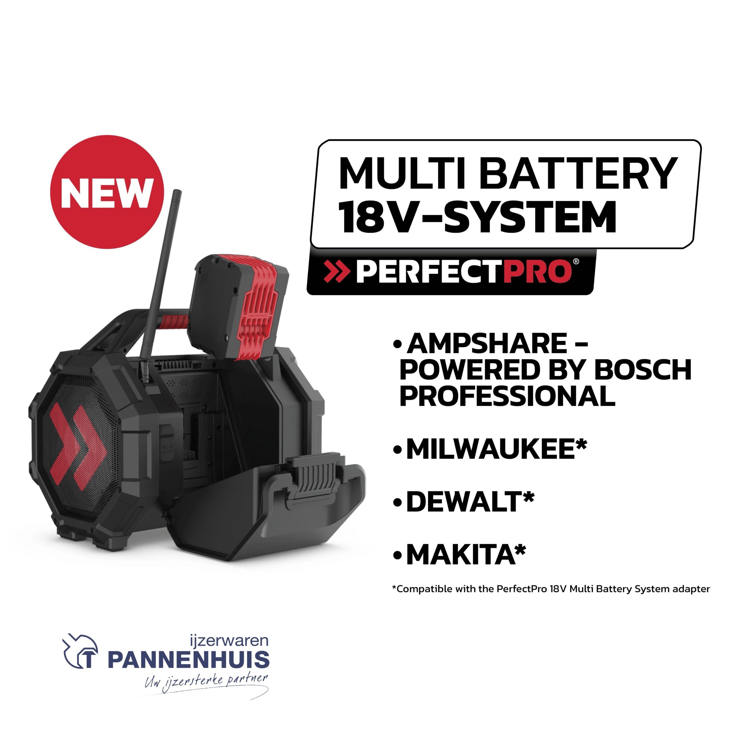*Dewalt werkt met PerfectPro 18V Multi Battery Systeem adapter tot 5Ah (Adapter niet bijgeleverd)