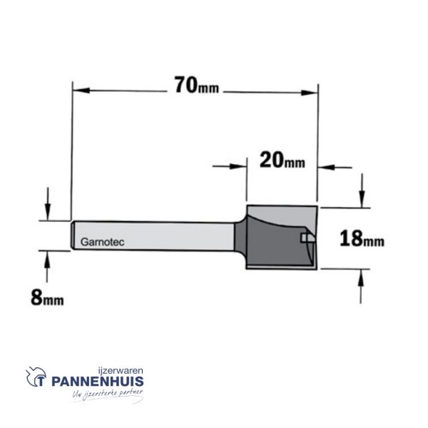 Rechte groeffrees, D=18, I=20, L=70, Z=Z2+1, S=Ø8, Kwaliteit=HW