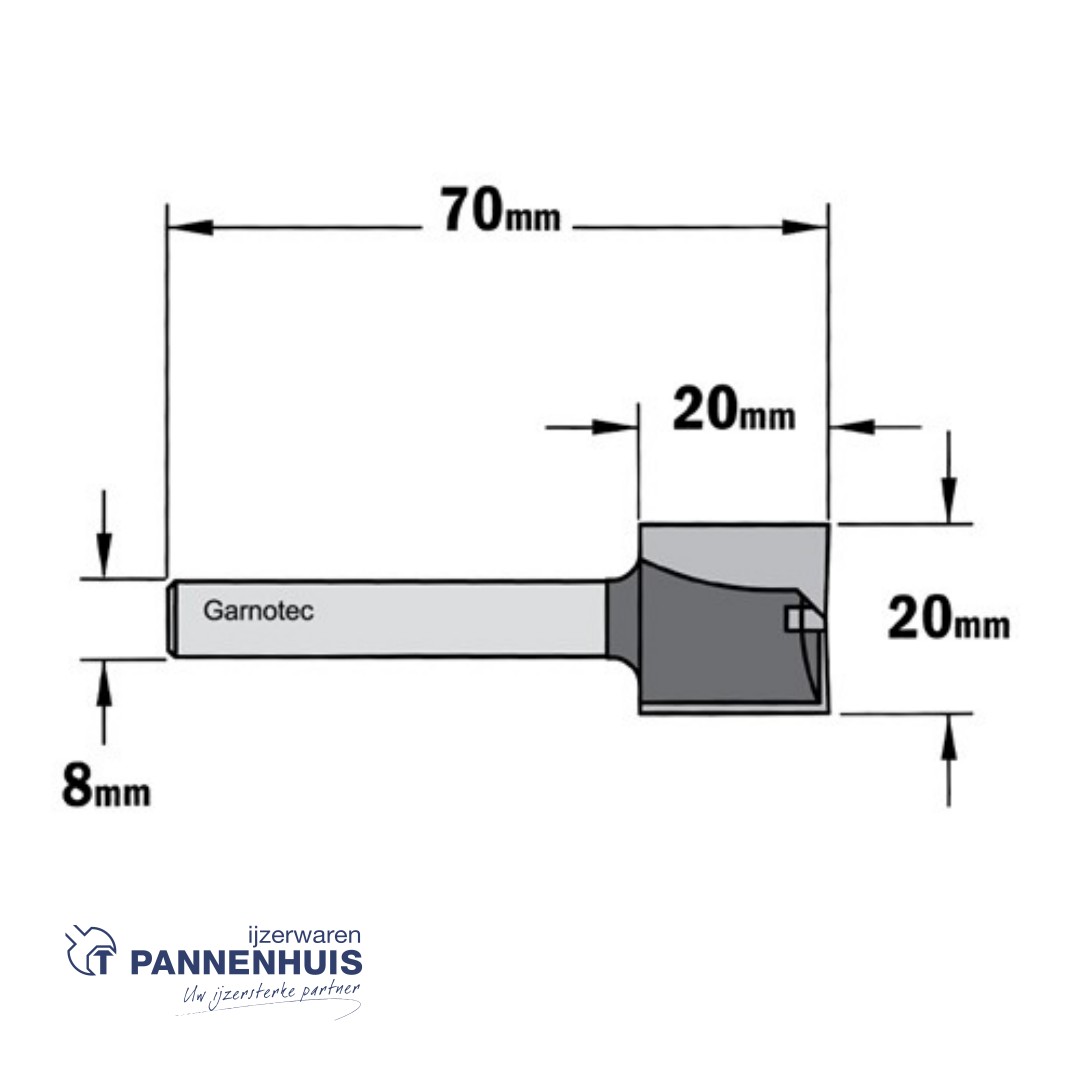 Rechte groeffrees, D=20, I=20, L=70, Z=Z2+1, S=Ø8, Kwaliteit=HW