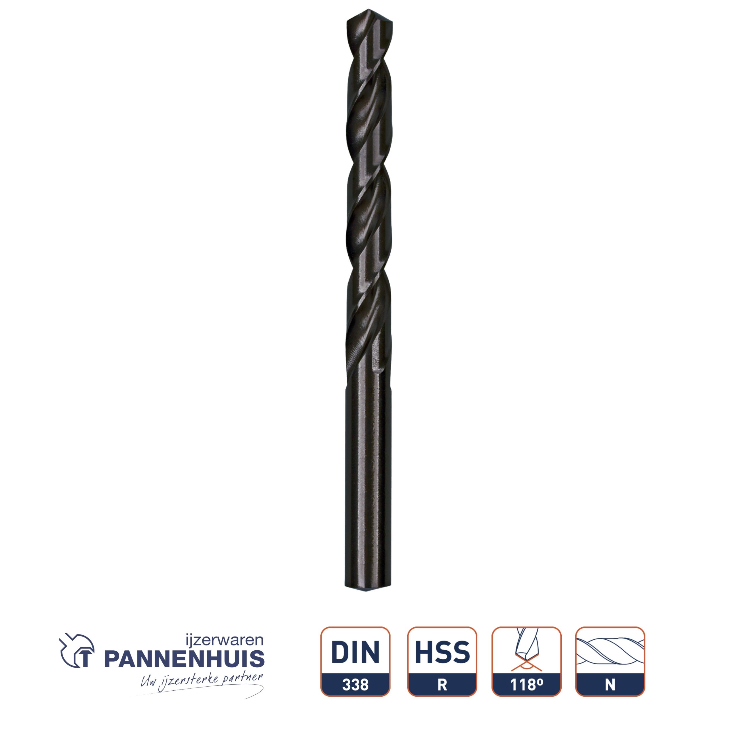 HSS-R Spiraalboor DIN 338, kort, type N, rolgewalste uitvoering, stoomontlaten, tophoek 118°.