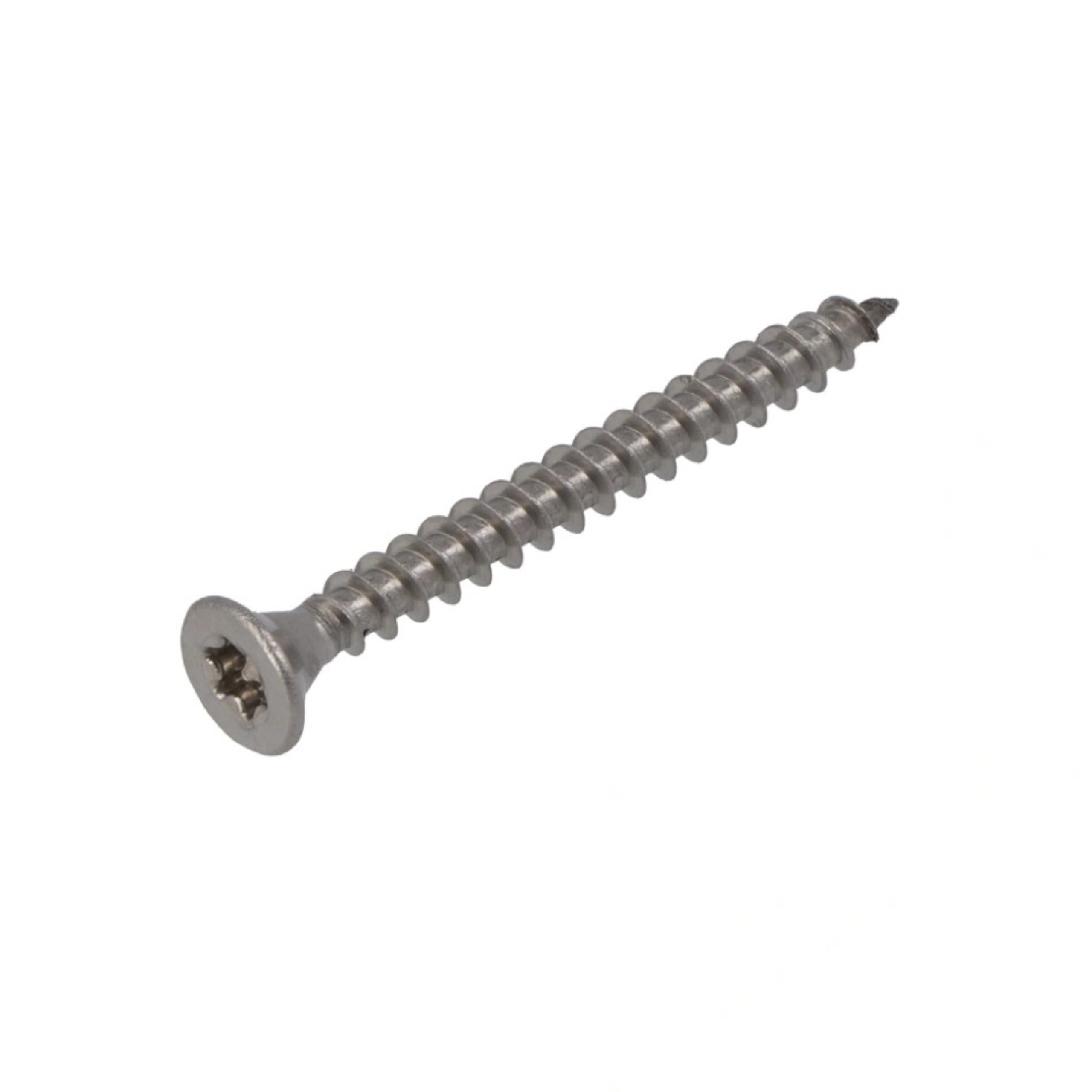 Spaanplaatschroef platverzonkenkop RVS A2 TX, voldraad. De spaanplaatschroef is een schroef met een scherpe, diepe draad en dunne schacht gemaakt van RVS A2. De spaanplaatschroef is de meest gebruikte schroef voor alle houtsoorten en plaatmateriaal.