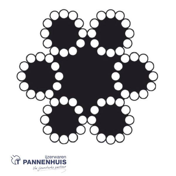DX Staalkabel 6×12 + 7 TWK, verzinkt bestaat uit 6 verzonken strengen van 12 staaldraden en 1 touwkern . De 6 strengen zijn kruisslag rechts om 1 touwkern geslagen, wat het totaal aantal toegepaste touwkernen op 7 brengt.