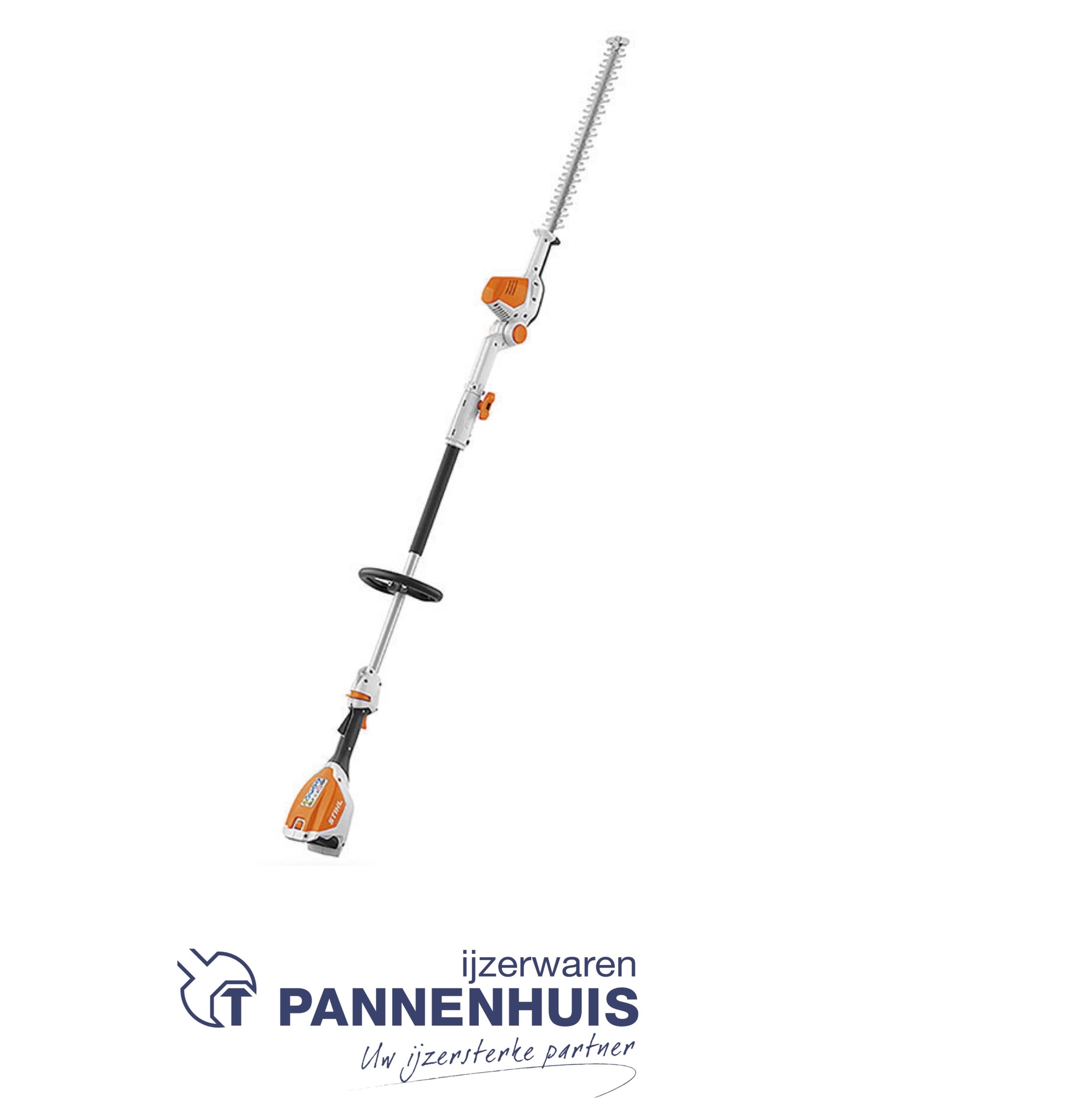Lichte accu heggenschaar op steel voor het snoeien van hoge heggen en struiken in privétuinen. Eénzijdig geslepen mes in druppelvorm, trapsgewijs instelbare meshoek van - 45° tot + 90°, deelbare schacht voor een gemakkelijk transport. Transportstand 115 cm, totale lengte 210 cm, gewicht 3,8 kg.
