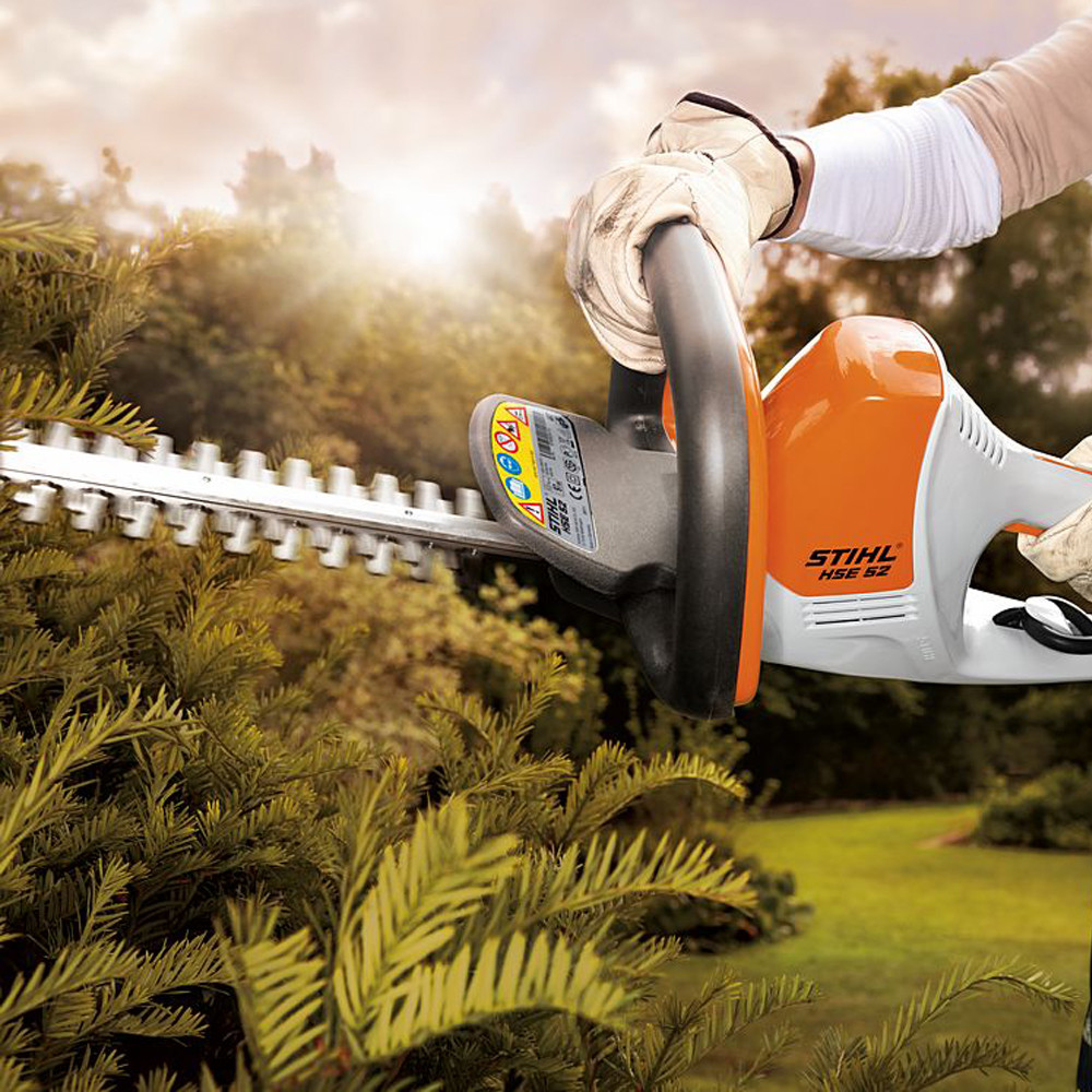 Geruisloos werkende, lichte elektrische heggenschaar om twijgen en dunnere takken te snoeien en te trimmen. Tweehandsbediening met slothendel.