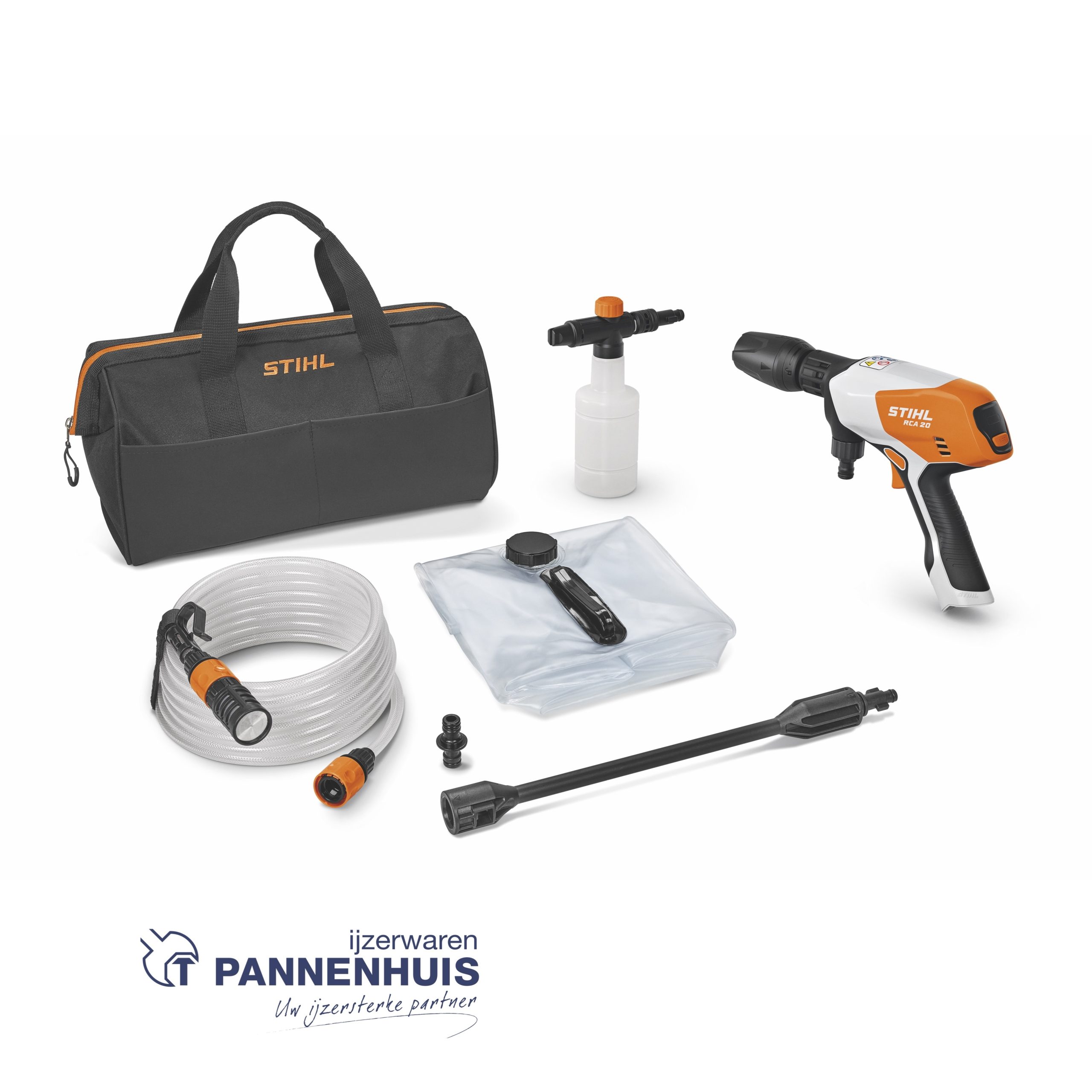 De Accudrukreiniger STIHL RCA 20 is een compacte en lichte machine. Hij is geschikt voor schoonmaakklusjes rondom het huis, maar ook voor een flexibel gebruik waar je ook bent. Hij werkt met lithium-ion-accu’s van het STIHL AS systeem. De STIHL RCA 20 kan volledig zelfstandig werken, dus ook op plaatsen zonder water- of elektriciteitsaansluiting. Als je geen wateraansluiting in de buurt hebt, kan je bijvoorbeeld water uit een regenton opzuigen met de zuigslang of de met de machine meegeleverde inklapbare watertank gebruiken.