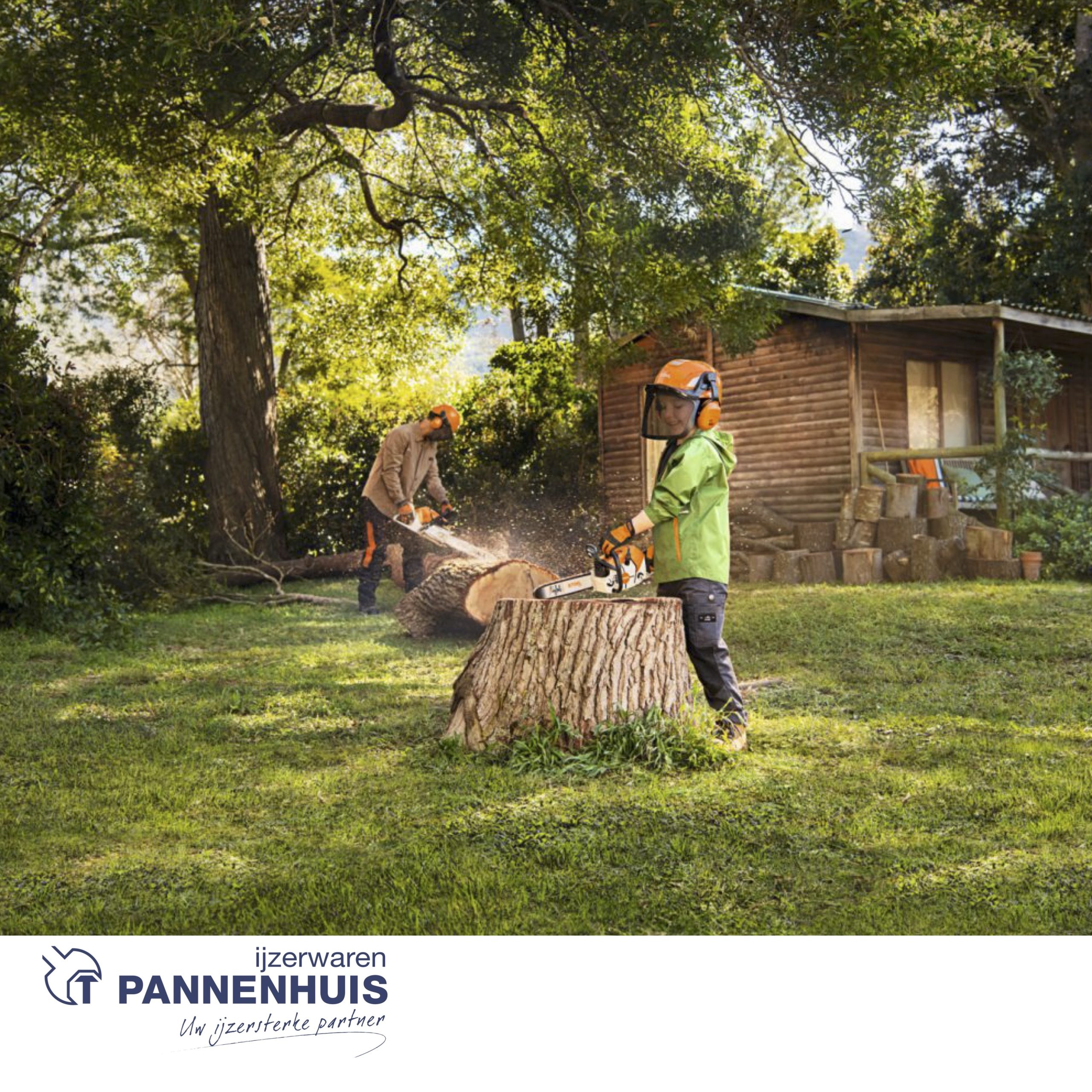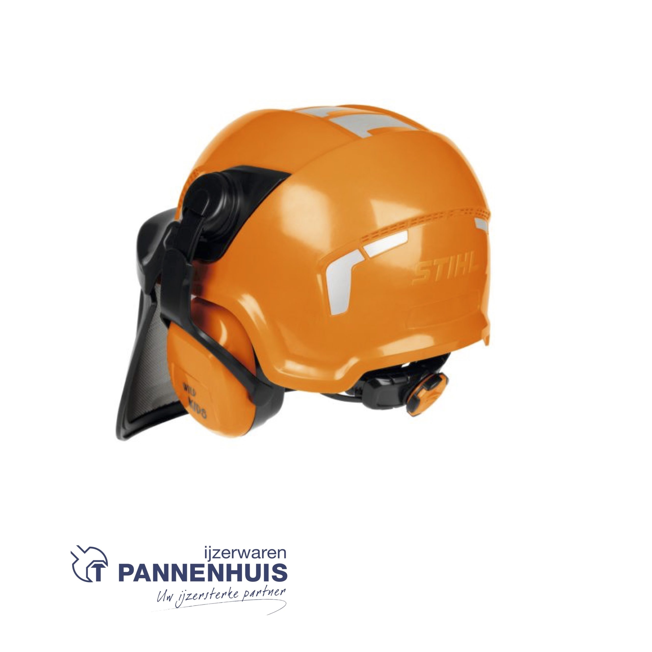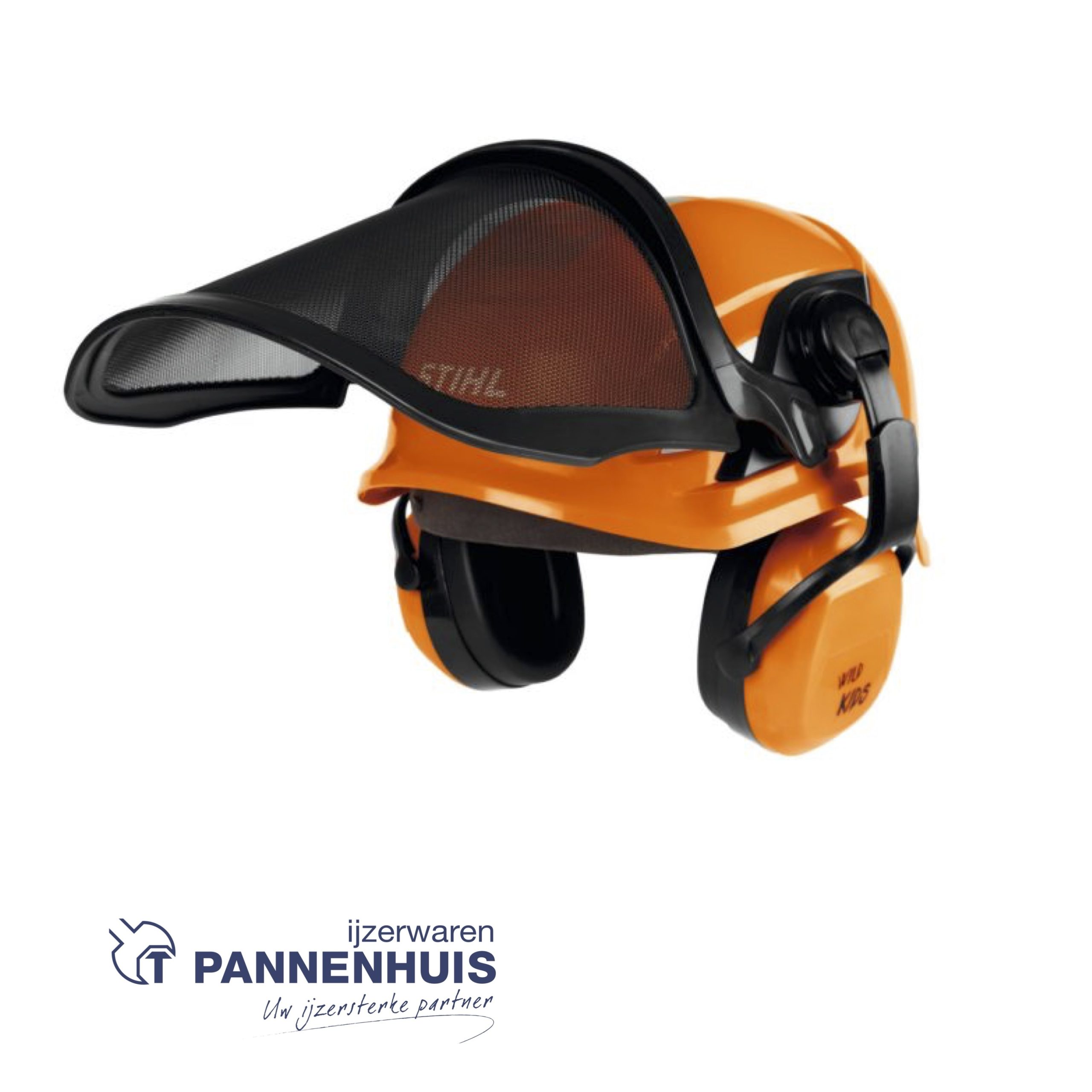 Natuurgetrouwe replica van de STIHL beroepshelm, ABS-kunststof, opvouwbaar vizier, maat verstelbaar, opvouwbare gehoorbescherming, geen beschermende functie, geschikt voor kinderen vanaf 3 jaar.