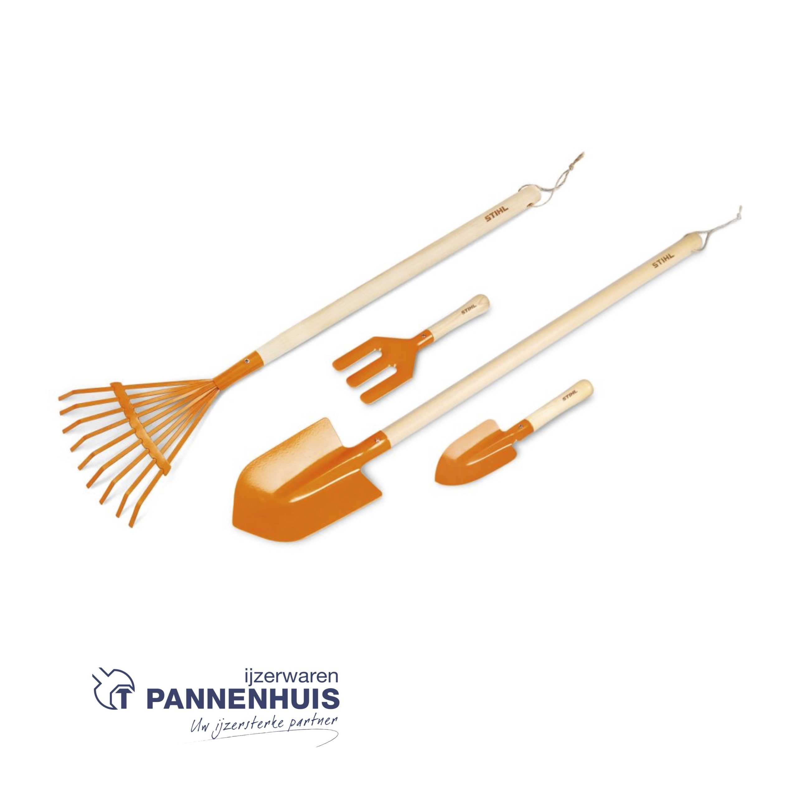 Voor toekomstige tuiniers: met deze hoogwaardige set kindertuingereedschap van STIHL kunnen ook de allerkleinsten samen met de groten in de tuin werken. De set bestaat uit een grote schep en hark en een kleine schep en hark. De vier gereedschappen zijn gemaakt van FSC-gecertificeerd gelakt dennenhout en gecoat metaal. De houten handvatten zijn voorzien van het STIHL logo.