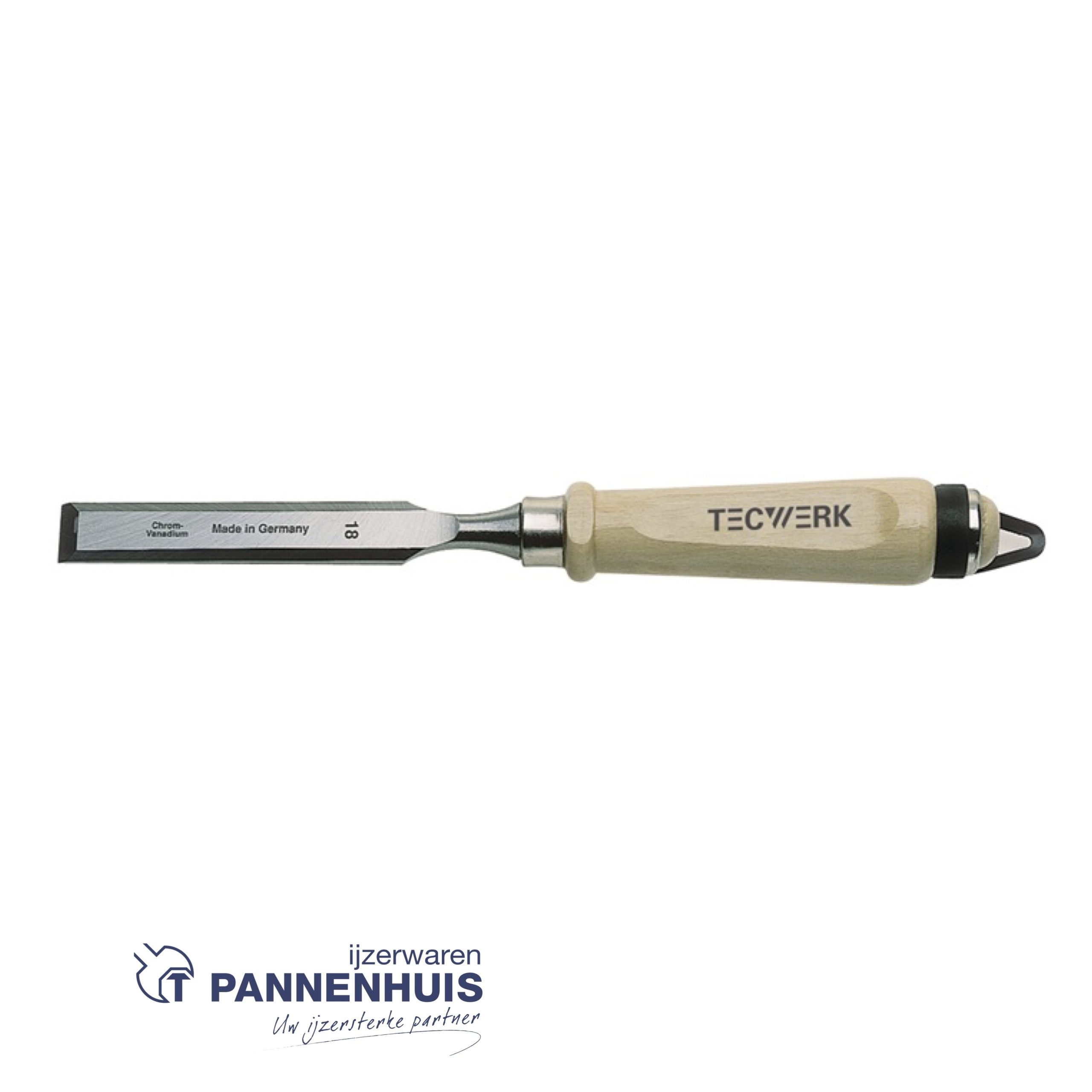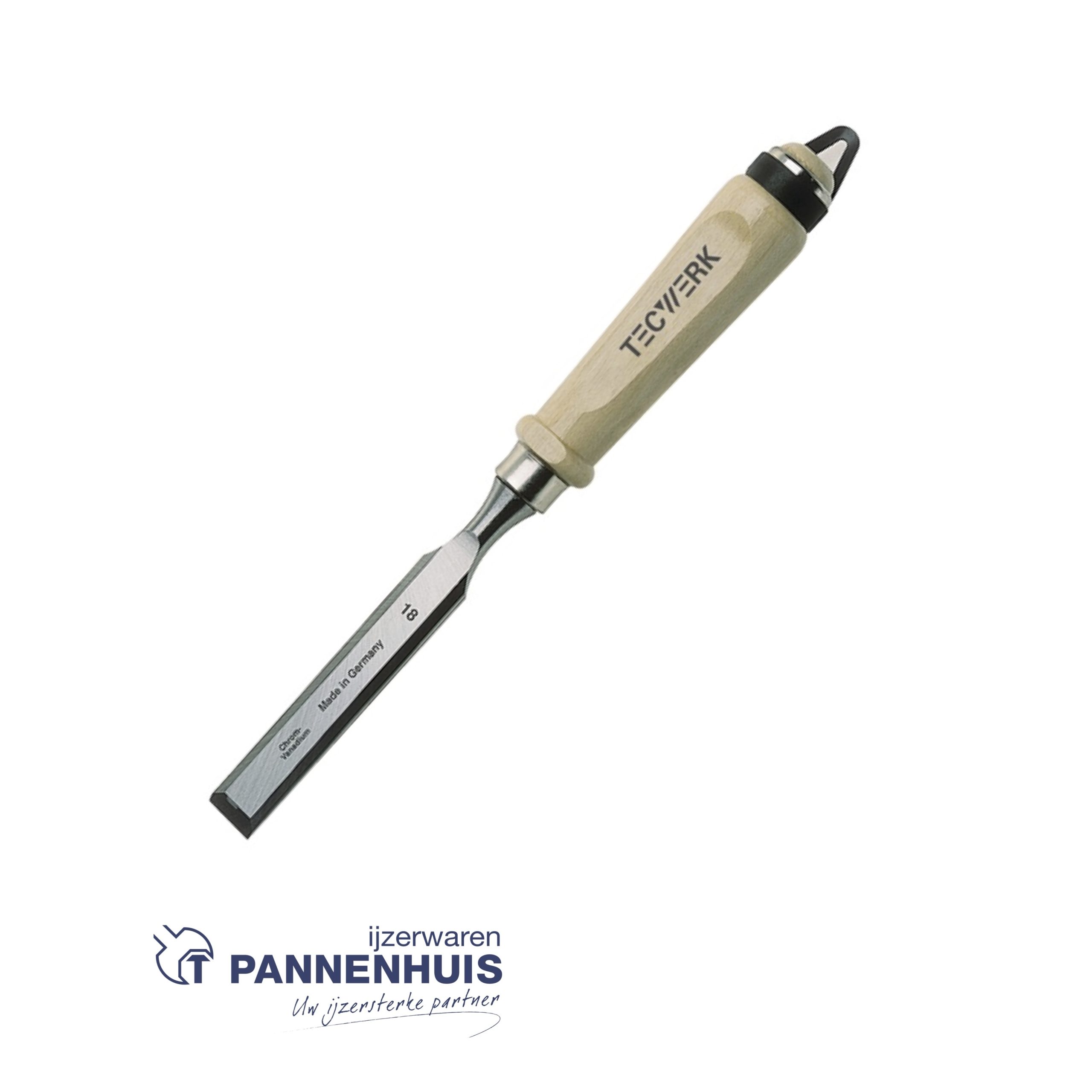 Chroom-vanadiumstaal · Fijngeslepen beitel · Afgevlakte witte beukenhouten greep model Ulm · Met klem