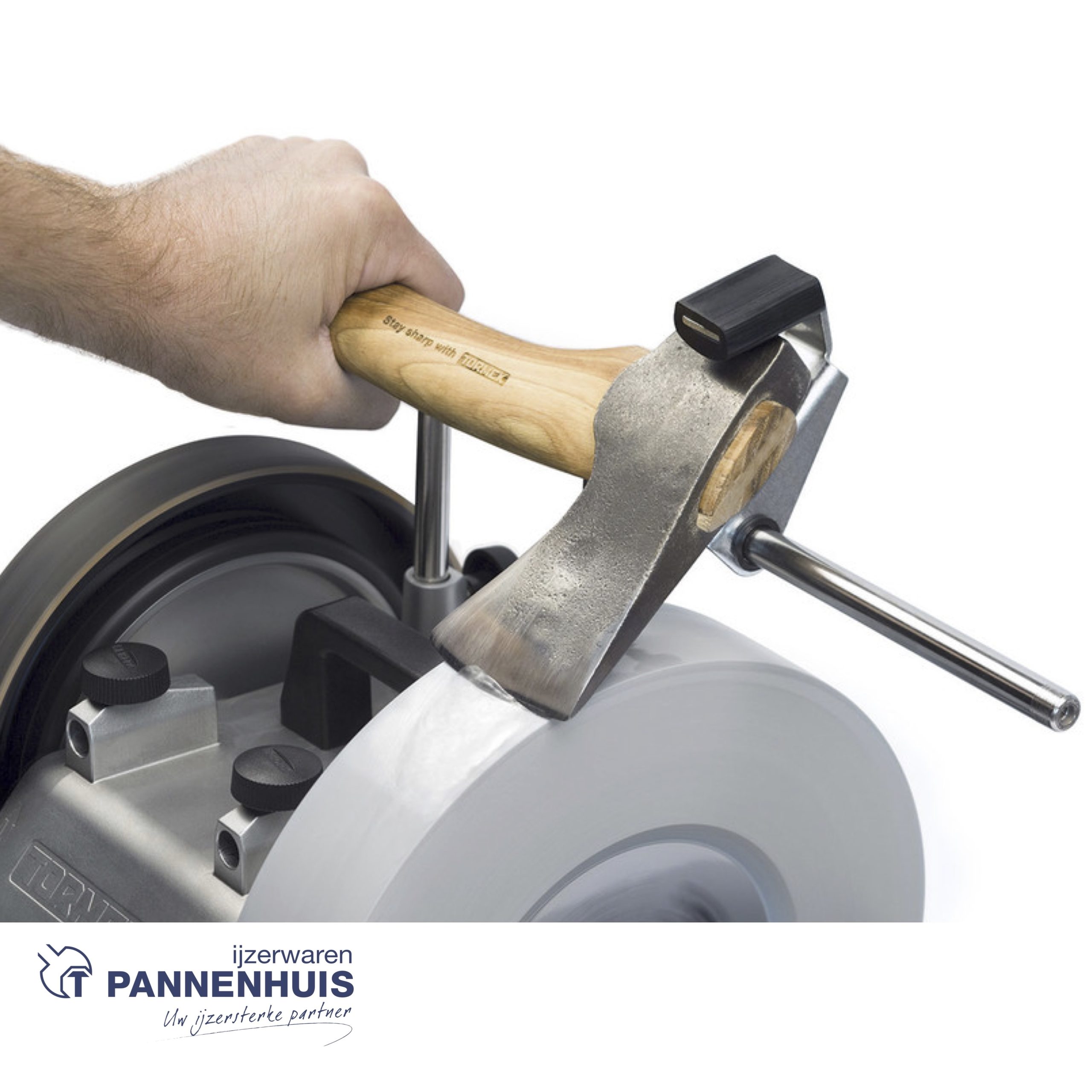 U zult verrast zijn hoe scherp u een bijl kunt slijpen met de SVA-170 slijpmal voor bijlen van Tormek. De bijl zit stevig in de mal en wordt aangescherpt met een constante slijphoek.