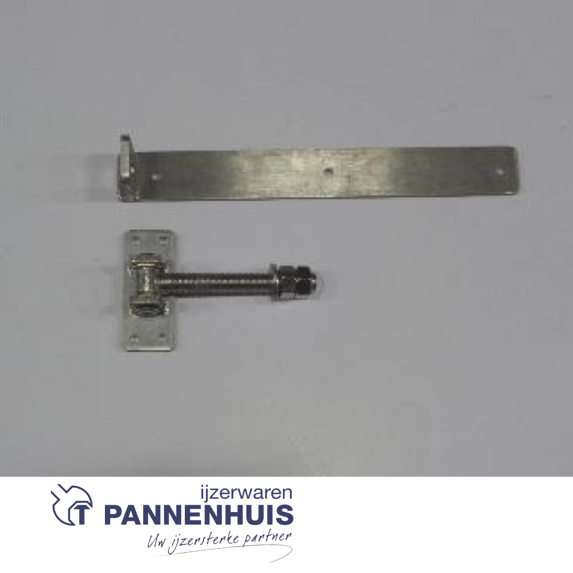 Verstelbaar poortbeslag – heng: 400x50x8mm – plaat: 120x50x8mm – dikte verticale lip: 8mm – diameter: 20mm – RVS – met 2 rondellen – verstelbaar in breedte en diepte