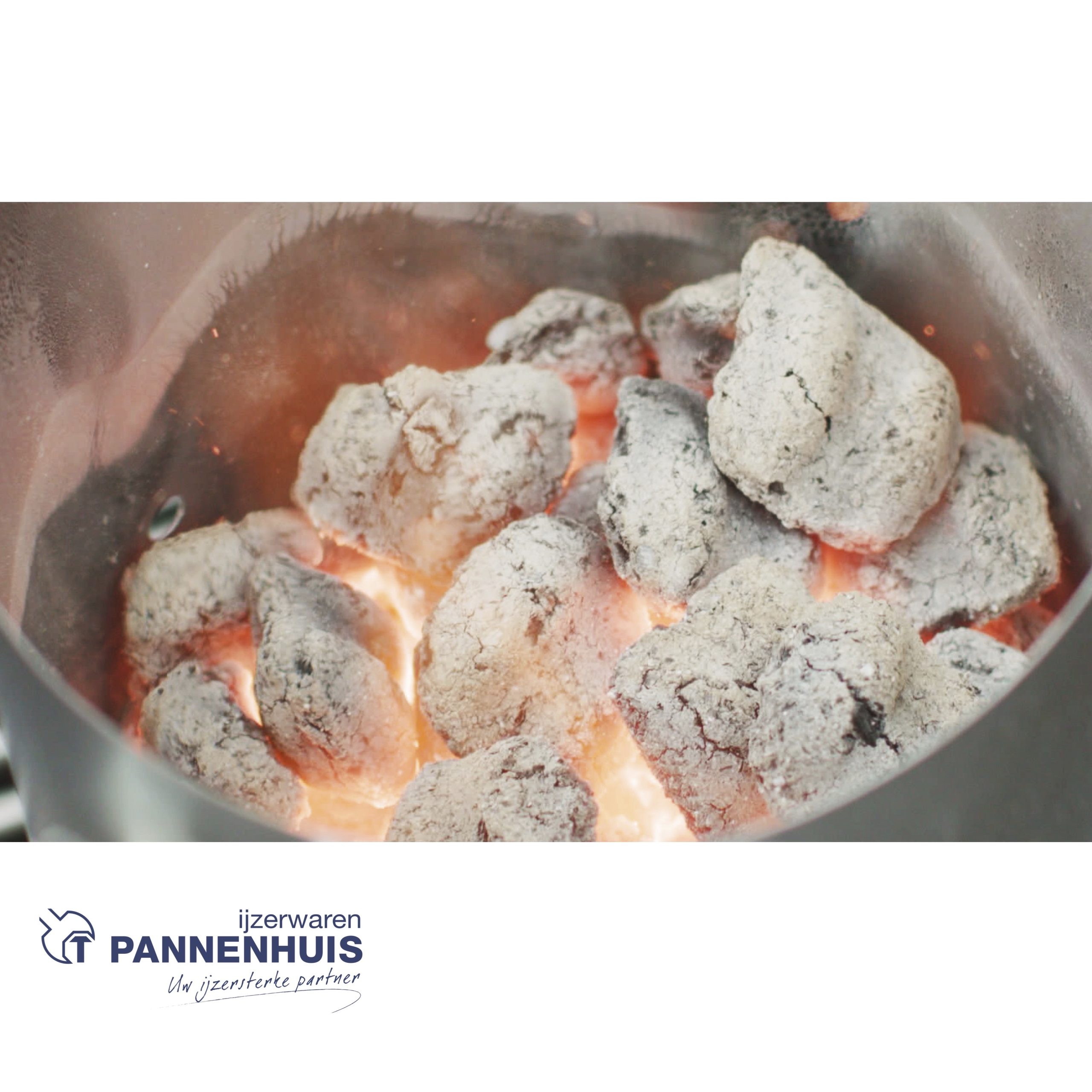 Ontwerp met twee handvatten voor betere controle bij het uitgieten van gloeiende houtskool/briketten