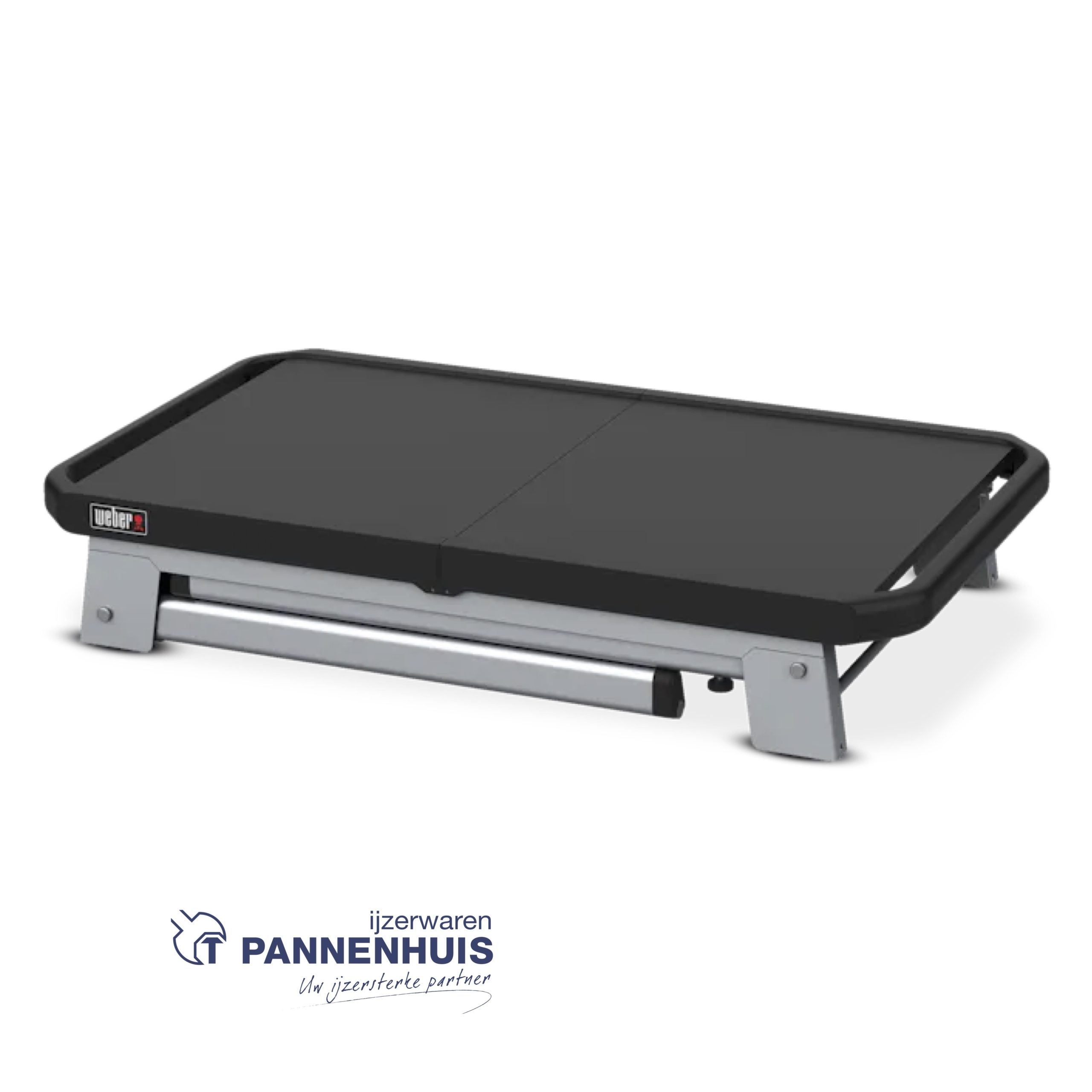 Het uitbreidbare onderstel past gemakkelijk in de kofferbak van je auto en als je je bestemming hebt bereikt, is hij binnen no-time opgezet. Het innovatieve ontwerp heeft verstelbare poten, zodat de bakplaat op elk oppervlak waterpas blijft staan. In de rail van het onderstel passen Weber Works clip-on-accessoires, zoals een specerijenhouder, zodat je alle benodigdheden bij de hand hebt voor de bakplaat. Als de twee zijtafels in elkaar schuiven als de bakplaat wordt verwijderd, ontstaat er een tafel om te serveren.
