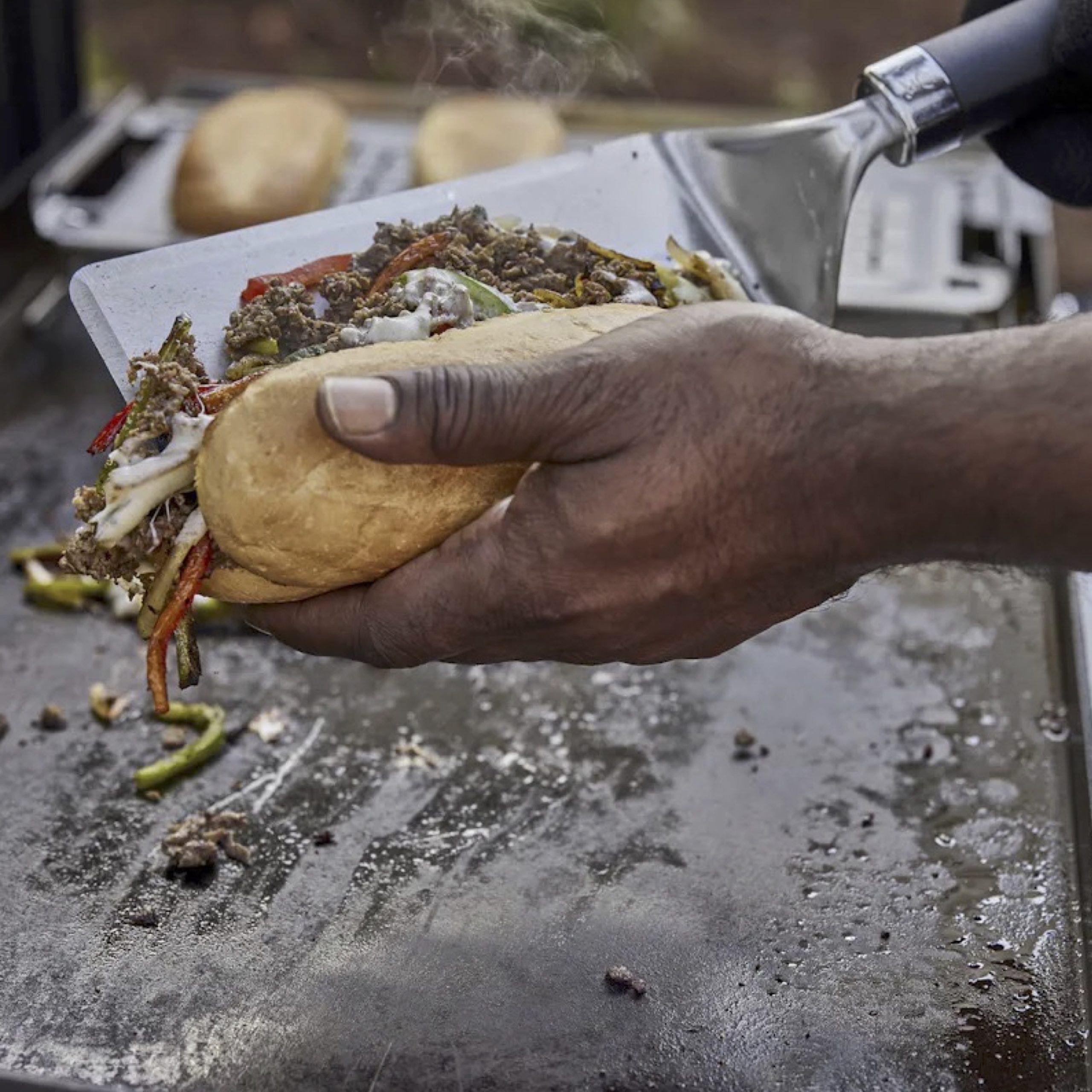 De spatel voor de bakplaat met antisliphandgreep en schuine rand die je eenvoudig onder je voedsel schuift, zorgt ervoor dat je je eten gemakkelijk kunt verplaatsen. De handgreep is ook verhoogd, zodat de spatel niet vies wordt als je hem even weglegt.