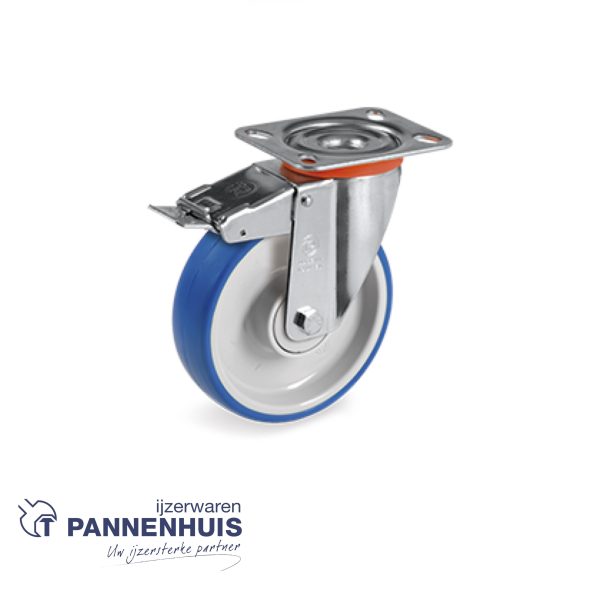 Wiel polyurethaan draaibare bovenplaat type NL met rem 100×30 Blauw